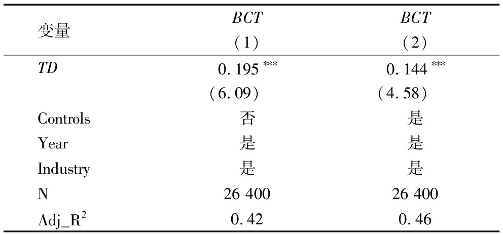 变量BCTBCT(1)(2)TD0.195∗∗∗0.144∗∗∗(6.09)(4.58)Controls否是Year是是Industry是是N26 40026 400Adj_R20.420.46