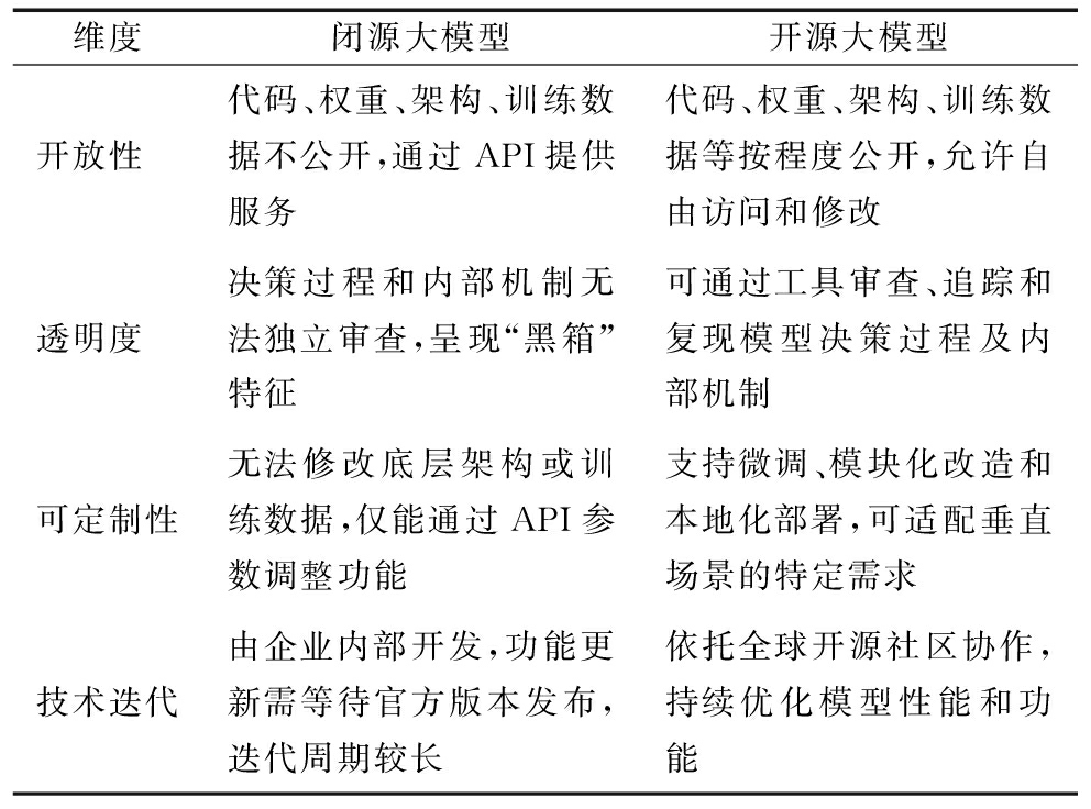 Table 1 Comparison of technical characteristics between closed-source and open-source large models