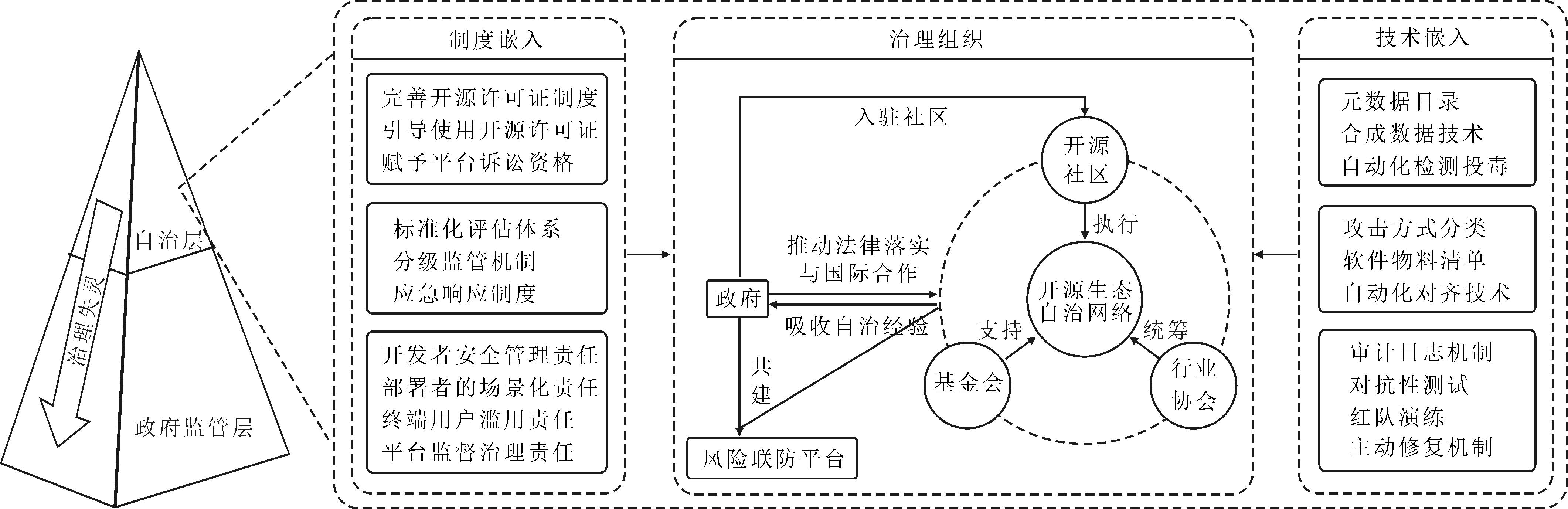 嵌入式治理强调将风险治理融入开源生态结构和运行逻辑,充分激活开源生态的自治潜能。为此,可构建“开源生态自治—政府监管”的递进式治理框架。在顶层自治层面,依托行业协会、基金会和开源社区形成开源生态自治网络,政府以共同治理者身份嵌入其中,并同步嵌入契合开源创新发展需求的制度规范和技术工具;当自治失灵时,次级行政监管层及时介入和控制风险,并通过合规机制使自治网络不断优化,最终实现治理从外部监管到生态内生驱动的转变,形成以开源生态自治为主导的嵌入式治理体系(见图1)。