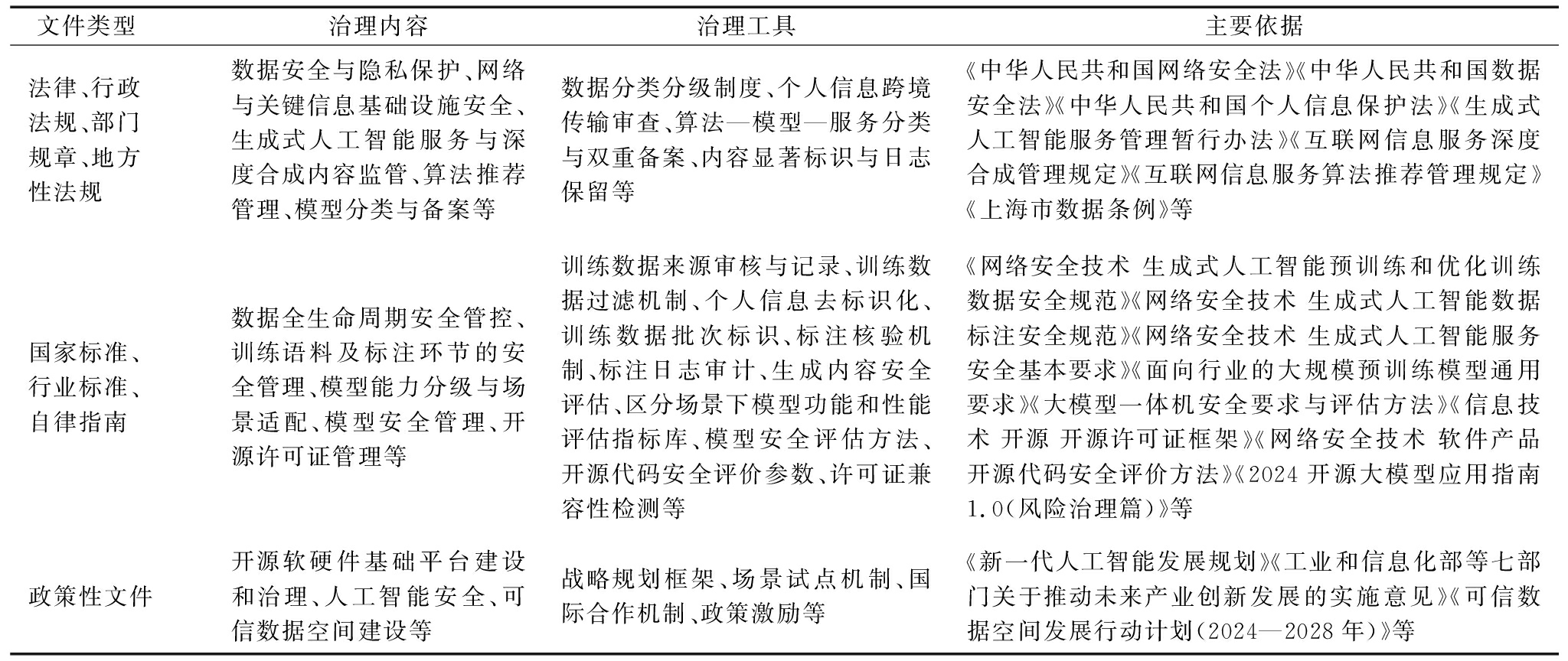 文件类型 治理内容治理工具主要依据法律、行政法规、部门规章、地方性法规数据安全与隐私保护、网络与关键信息基础设施安全、生成式人工智能服务与深度合成内容监管、算法推荐管理、模型分类与备案等数据分类分级制度、个人信息跨境传输审查、算法—模型—服务分类与双重备案、内容显著标识与日志保留等《中华人民共和国网络安全法》《中华人民共和国数据安全法》《中华人民共和国个人信息保护法》《生成式人工智能服务管理暂行办法》《互联网信息服务深度合成管理规定》《互联网信息服务算法推荐管理规定》《上海市数据条例》等国家标准、行业标准、自律指南数据全生命周期安全管控、训练语料及标注环节的安全管理、模型能力分级与场景适配、模型安全管理、开源许可证管理等训练数据来源审核与记录、训练数据过滤机制、个人信息去标识化、训练数据批次标识、标注核验机制、标注日志审计、生成内容安全评估、区分场景下模型功能和性能评估指标库、模型安全评估方法、开源代码安全评价参数、许可证兼容性检测等《网络安全技术 生成式人工智能预训练和优化训练数据安全规范》《网络安全技术 生成式人工智能数据标注安全规范》《网络安全技术 生成式人工智能服务安全基本要求》《面向行业的大规模预训练模型通用要求》《大模型一体机安全要求与评估方法》《信息技术 开源 开源许可证框架》《网络安全技术 软件产品开源代码安全评价方法》《2024开源大模型应用指南1.0(风险治理篇)》等政策性文件开源软硬件基础平台建设和治理、人工智能安全、可信数据空间建设等战略规划框架、场景试点机制、国际合作机制、政策激励等《新一代人工智能发展规划》《工业和信息化部等七部门关于推动未来产业创新发展的实施意见》《可信数据空间发展行动计划(2024—2028年)》等
