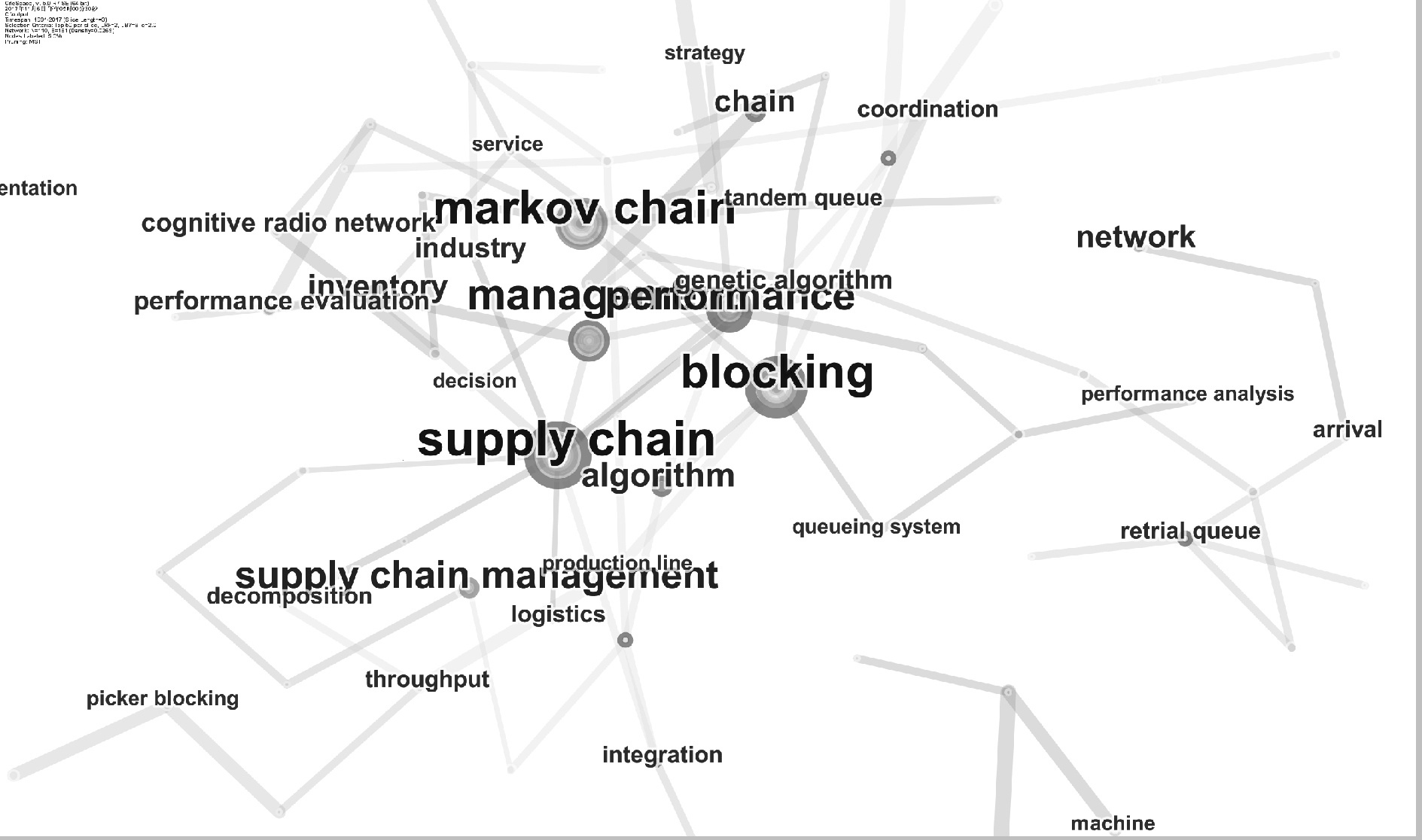 图4表明,国际研究热点分布在供应链、区块、供应链管理、队列、算法、库存等领域,主要研究方法与工具模拟、马尔可夫链、系统、排队网络、模型等,研究目标为管理优化、绩效评估、性能提升、时间等。中心性在0.1以上的节点为系统、区块、有限缓冲区、算法、设计,其连接多个关键词,最终形成研究主题网络。