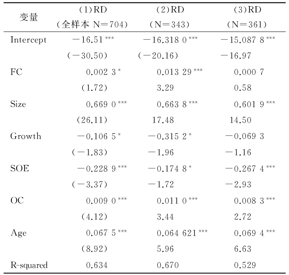 变量(1)RD(N=422)2009年、2010年、2011年(2)RD(N=282)2012年、2013年Intercept-17.817***-16.882***(-25.98)(-17.76)FC0.0063**-0.0034(2.21)(-0.50)Size0.7346***0.6776***(23.25)(16.17)Growth0.01860.2341(0.38)(1.07)SOE-0.098-0.2459**(1.22)(-2.27)OC0.0122***0.0096***(4.75)(2.73)Age0.0391***0.0419***(3.98)(3.11)R-squared0.64040.5777