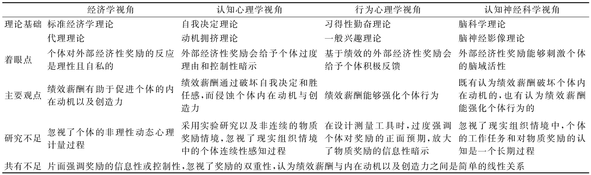 上文回顾了40多年来,研究者从经济学、认知心理学、行为心理学和认知神经科学4种视角对绩效薪酬与内在动机以及个体创造力关系的探索和争议,并梳理了近几年从线性研究到非线性研究的理论演进。理论进步建立在分析现有研究不足的基础上,对绩效薪酬与创造力关系的非线性思考正是基于对不同视角研究的比较和不足进行的分析。4种研究视角的理论基础、着眼点、主要观点以及研究局限的比较如表1所示。