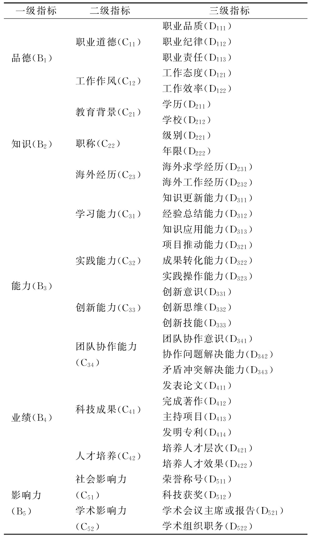 一级指标二级指标三级指标品德(B1)职业道德(C11)职业品质(D111)职业纪律(D112)职业责任(D113)工作作风(C12)工作态度(D121)工作效率(D122)知识(B2)教育背景(C21)学历(D211)学校(D212)职称(C22)级别(D221)年限(D222)海外经历(C23)海外求学经历(D231)海外工作经历(D232)能力(B3)学习能力(C31)知识更新能力(D311)经验总结能力(D312)知识应用能力(D313)实践能力(C32)项目推动能力(D321)成果转化能力(D322)实践操作能力(D323)创新能力(C33)创新意识(D331)创新思维(D332)创新技能(D333)团队协作能力(C34)团队协作意识(D341)协作问题解决能力(D342)矛盾冲突解决能力(D343)业绩(B4)科技成果(C41)发表论文(D411)完成著作(D412)主持项目(D413)发明专利(D414)人才培养(C42)培养人才层次(D421)培养人才效果(D422)影响力(B5)社会影响力(C51)荣誉称号(D511)科技获奖(D512)学术影响力(C52)学术会议主席或报告(D521)学术组织职务(D522)