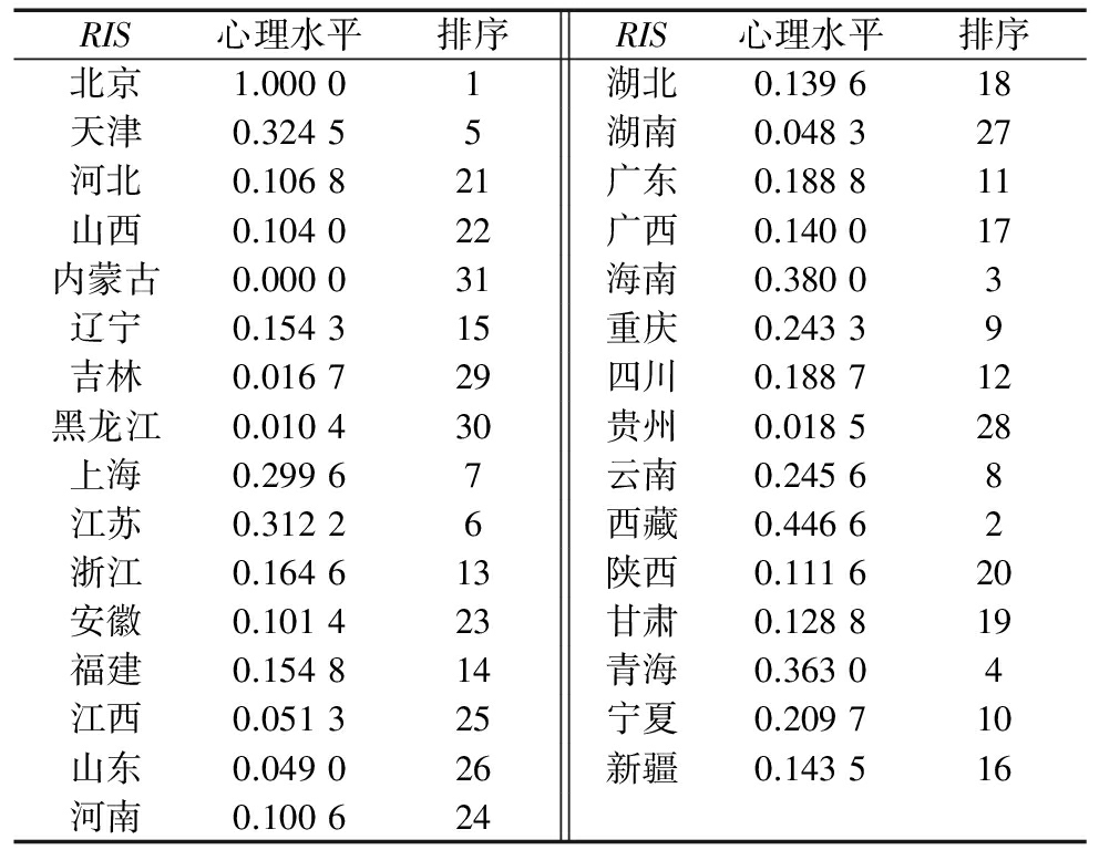 利用RIS心理水平测度模型测度了2014年我国内地31个省市自治区RIS的心理水平,结论如下: