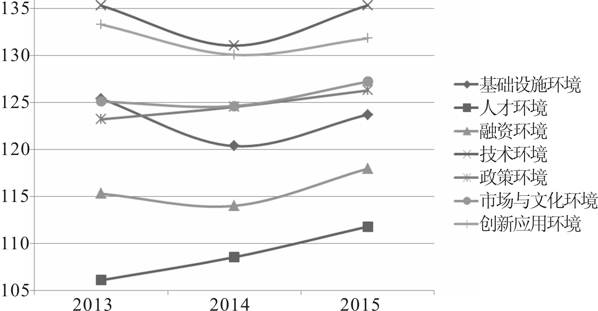 年份基础设施环境指数人才环境指数融资环境指数技术环境指数政策环境指数市场与文化环境指数创新应用环境科技创新环境总体指数2013125.40106.10115.30135.30123.20125.10133.30123.392014120.36108.55114.01131.04124.52124.62130.07121.882015123.71111.80117.97135.33126.28127.21131.82124.872015-20143.353.253.964.291.762.591.752.99