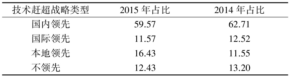 技术赶超战略类型2015年占比2014年占比国内领先59.5762.71国际领先11.5712.52本地领先16.4311.55不领先 12.4313.20