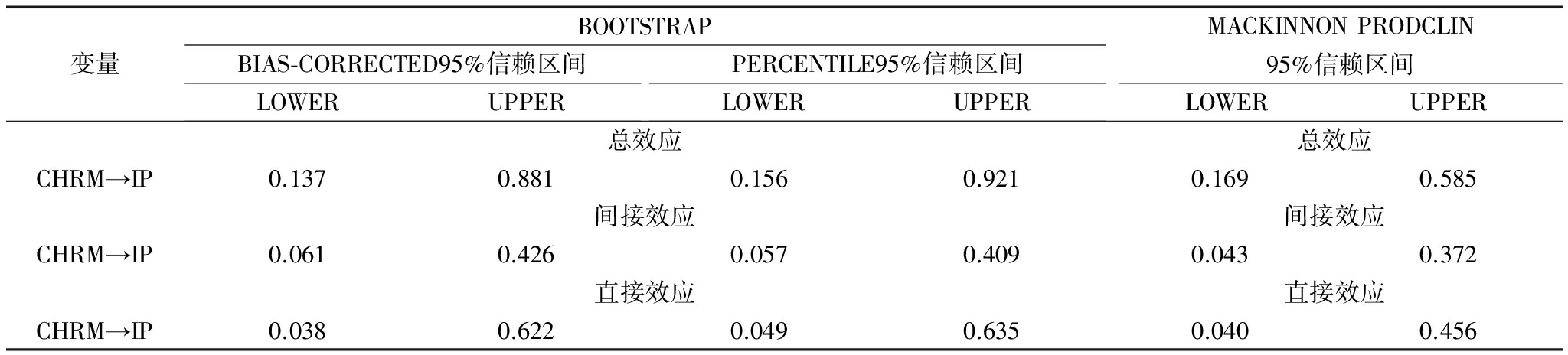 变量BOOTSTRAPBIAS⁃CORRECTED95%信赖区间LOWERUPPERPERCENTILE95%信赖区间LOWERUPPERMACKINNONPRODCLIN95%信赖区间LOWERUPPER总效应总效应CHRM→IP0.1370.8810.1560.9210.1690.585间接效应间接效应CHRM→IP0.0610.4260.0570.4090.0430.372直接效应直接效应CHRM→IP0.0380.6220.0490.6350.0400.456