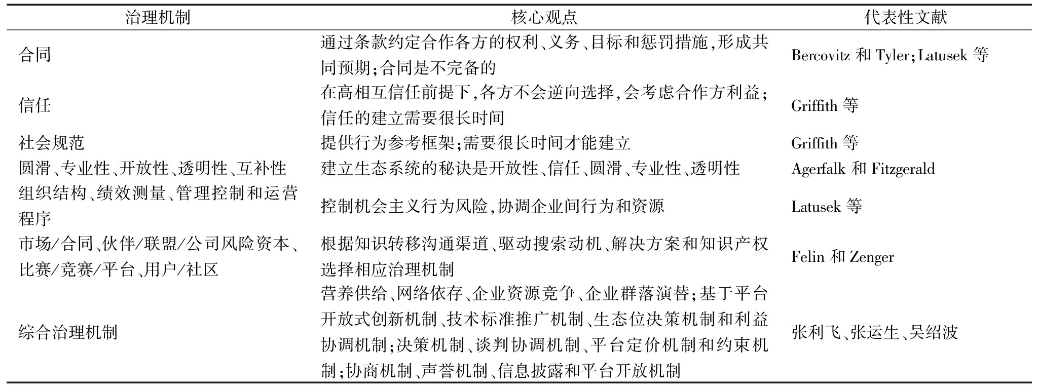 我国学者在分析企业创新生态系统治理机制时,更多地将以上机制进行综合,依据自身研究视角提出相应治理机制。例如,张利飞提出,高技术企业生态系统治理机制包括基于平台的开放式创新机制、技术标准推广机制、生态位决策机制和利益协调机制4种类型。张运生设计了决策机制、谈判协调机制、平台定价机制和约束机制相结合的治理机制。吴绍波认为,企业创新生态系统治理机制包括协商机制、声誉机制、信息披露和平台开放机制及信任机制,通过多种治理机制的综合运用,可抑制成员机会主义行为并实现共同价值。