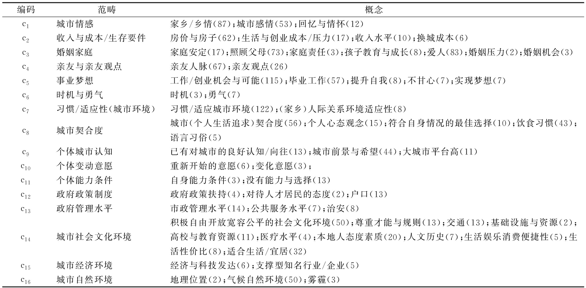 根据概念化与频次分析结果,习惯/适应城市环境(122)、工作/创业机会与可能(115)、毕业工作(57)、爱人/婚姻(87)、家乡/乡情(87)、父母家庭(76)、亲友人脉(67)、房价与房子(62)、城市(个人生活追求)契合度(56)、城市感情(53)、积极自由开放宽容公平的社会文化环境(50)、气候自然环境(50)是影响人才城市居留意愿或居留行为的关键概念(概念频次大于50),如表2所示。