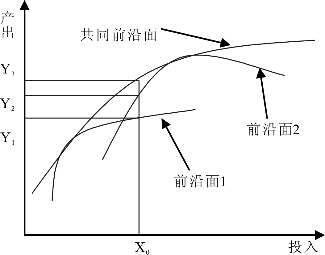 其中,β*表示共同前沿函数的参数向量,且满足不同技术水平集群的产出均小于共同前沿曲线上产出的条件。