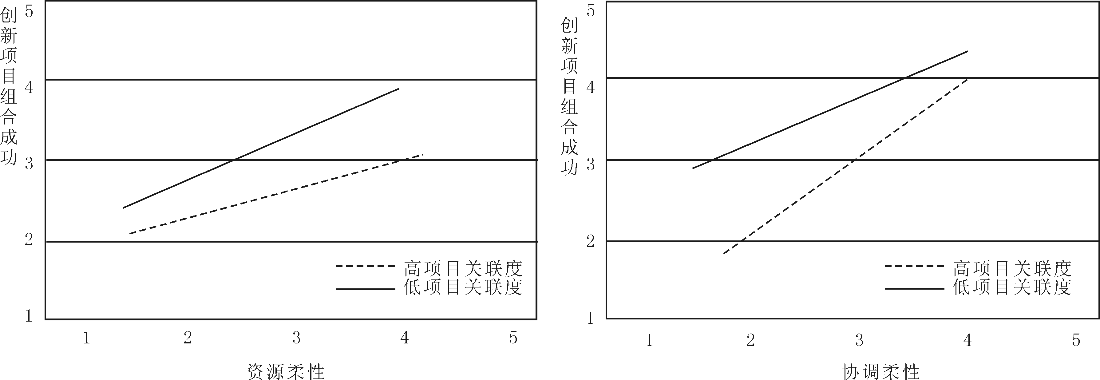 (3)项目关联度分别调节了资源柔性、协调柔性与创新项目组合成功的关系,但调节作用的方向不同。具有较高关联度的创新项目组合,项目之间多存在资源共享关系,企业可以利用资源在不同项目之间进行拆借和调配,实现资源节约利用。但是,关联度越高的项目组合往往越为复杂,需要企业具有较强的规划、组织和协调能力,才能产生项目组合协同效应。因此,高关联度的创新项目组合并不需要企业具有大量资源,但对企业协调能力提出了较高要求。