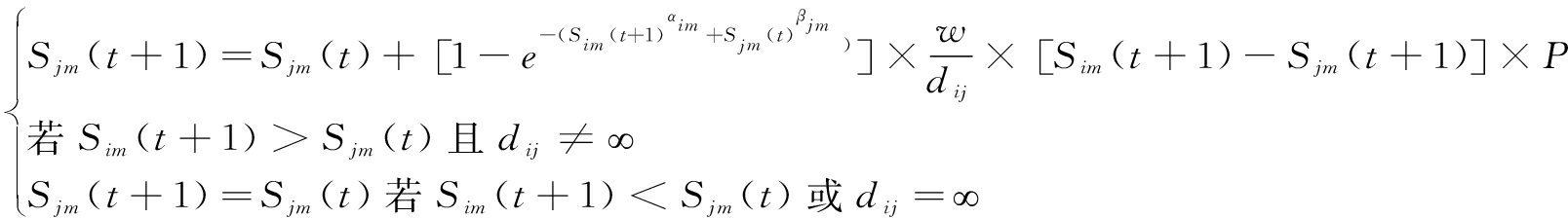 其中,Sjm(t+1)表示创新输入主体j的第m类知识在t+1时期的创新存量;Sjm(t)表示创新输入主体的第m类知识在t时期的创新存量;Sim(t+1)表示创新输出主体在进行技术创新后第m类知识的创新存量;αim表示创新主体i的第m类知识解吸能力;βjm表示创新主体j的第m类知识吸收能力;w表示创新网络关系强度;dij表示创新主体i和创新主体j之间的创新合作关系距离;P表示集群中创新主体开放程度;Sim(t+1)和Sjm(t)的关系是创新主体i与创新主体j之间的第m类知识的技术差距。