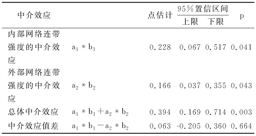 中介效应点估计95%置信区间上限下限p内部网络连带强度的中介效应a1*b10.2280.0670.5170.041外部网络连带强度的中介效应a2*b20.1660.0370.3550.043总体中介效应a1*b1+a2*b20.3940.1690.7140.003中介效应值差a1*b1-a2*b20.063-0.2050.3600.664