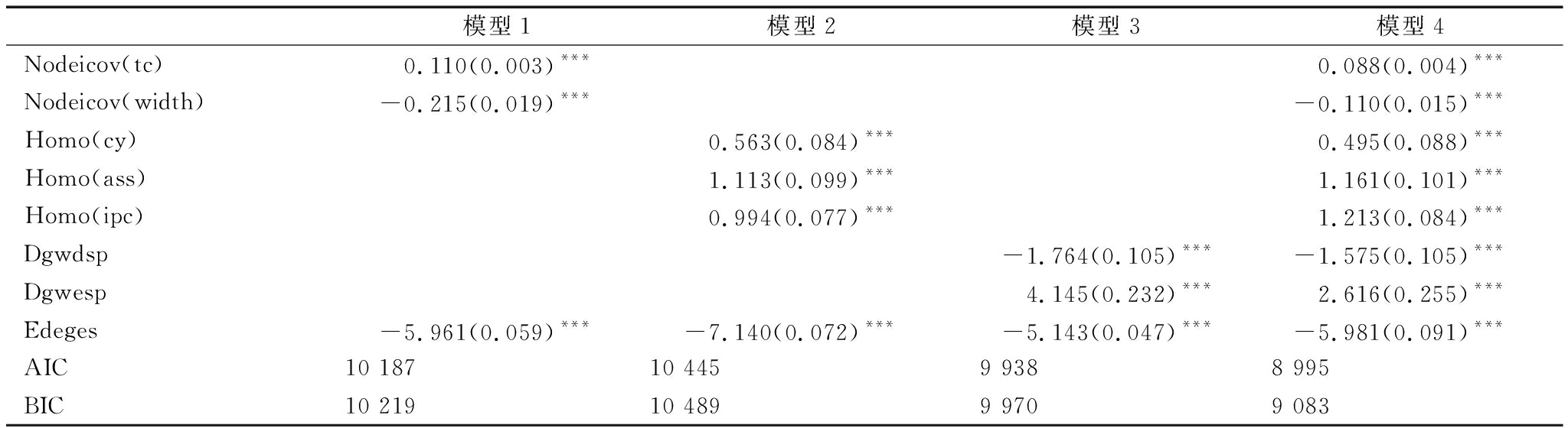 模型1模型2模型3模型4Nodeicov(tc)0.110(0.003)***0.088(0.004)***Nodeicov(width)-0.215(0.019)***-0.110(0.015)***Homo(cy)0.563(0.084)***0.495(0.088)***Homo(ass)1.113(0.099)***1.161(0.101)***Homo(ipc)0.994(0.077)***1.213(0.084)***Dgwdsp-1.764(0.105)***-1.575(0.105)***Dgwesp4.145(0.232)***2.616(0.255)***Edeges-5.961(0.059)***-7.140(0.072)***-5.143(0.047)***-5.981(0.091)***AIC10 18710 4459 9388 995BIC10 21910 4899 9709 083