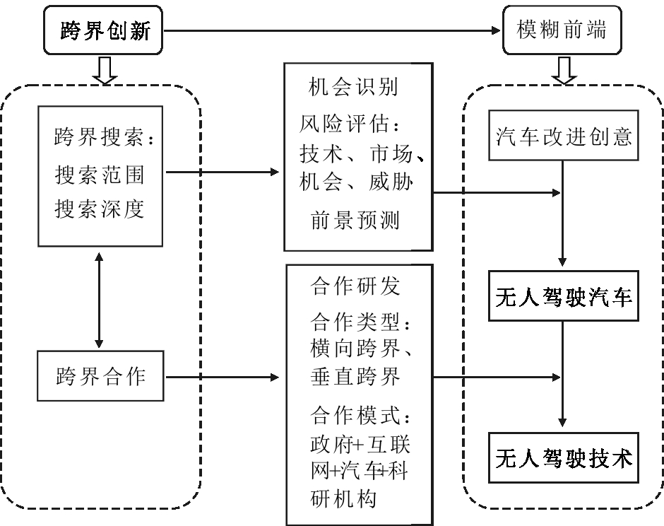 3.4 无人驾驶汽车跨界创新对突破性技术创新模糊前端的作用 谷歌、百度无人驾驶汽车从创意到技术研发成功,具有高度的不确定性和模糊性,这是突破性技术创新的模糊前端,在这个过程中,谷歌、百度通过跨界搜索进行创意搜集和创意筛选,又通过与其它机构跨界合作进行强强联合,提升研发效率和成功率。在这两个过程中,跨界搜索与跨界合作相辅相成,构成跨界创新在突破性技术创新模糊前端的作用机制,如图4所示。