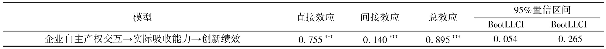 其次是实际吸收能力的中介效应检验。结果如表5所示,模型5结果表明实际吸收能力显著部分中介企业自主知识产权交互与创新绩效间关系(β=0.575<0.682,P<0.001;β=0.240,P<0.001)。因此,假设H3得到验证。另外,为了进一步验证实际吸收能力的中介作用,本研究采用Bootstrap检验方法,通过重复随机抽样5 000次计算中介效应置信区间。实际吸收能力中介效应的Bootstrapping检验结果如表6所示。其中,实际吸收能力对企业自主产权交互与创新绩效之间的间接效应为0.140,95%置信区间为[0.054, 0.265],不包含0,说明实际吸收能力的中介效应显著,假设H3得到进一步支持。