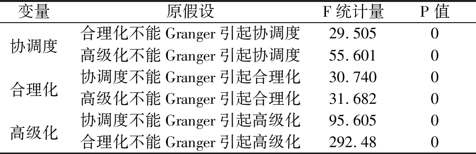 (4)Granger因果检验。Granger因果检验是判定模型变量间是否存在因果关系的重要标准,本文利用其对粤港澳大湾区经济协调发展水平与产业结构合理化、产业结构高级化的因果关系进行判定。