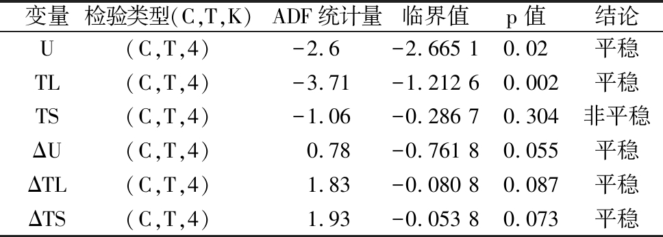 (1)数据平稳性。由于非平稳性的存在,对时间序列数据进行分析时容易导致伪回归现象,因而本文在开展实证分析之前使用ADF法对变量实施平稳性检验。由表1可知,原始数据中U与TL在5%显著性水平之下平稳,TS为非平稳状况。经一阶差分后,各数据均在10%显著性水平下为平稳数据。因此,各数据平稳性符合VAR建模条件。