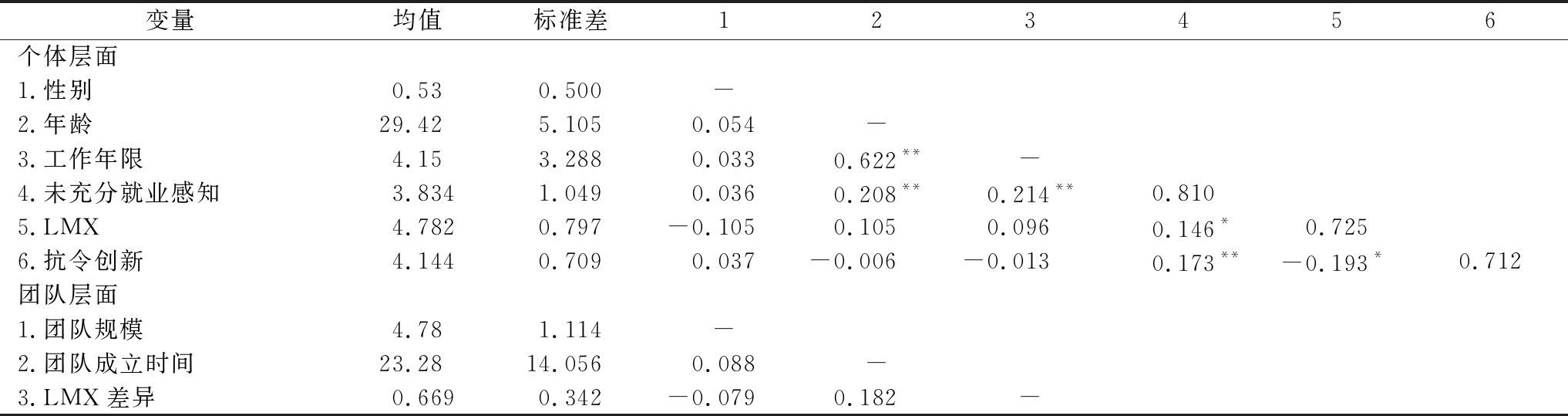 变量均值标准差123456个体层面1.性别0.530.500-2.年龄29.425.1050.054-3.工作年限4.153.2880.0330.622**-4.未充分就业感知3.8341.0490.0360.208**0.214**0.8105.LMX4.7820.797-0.1050.1050.0960.146*0.7256.抗令创新4.1440.7090.037-0.006-0.0130.173**-0.193*0.712团队层面1.团队规模4.781.114-2.团队成立时间23.2814.0560.088-3.LMX差异0.6690.342-0.0790.182-