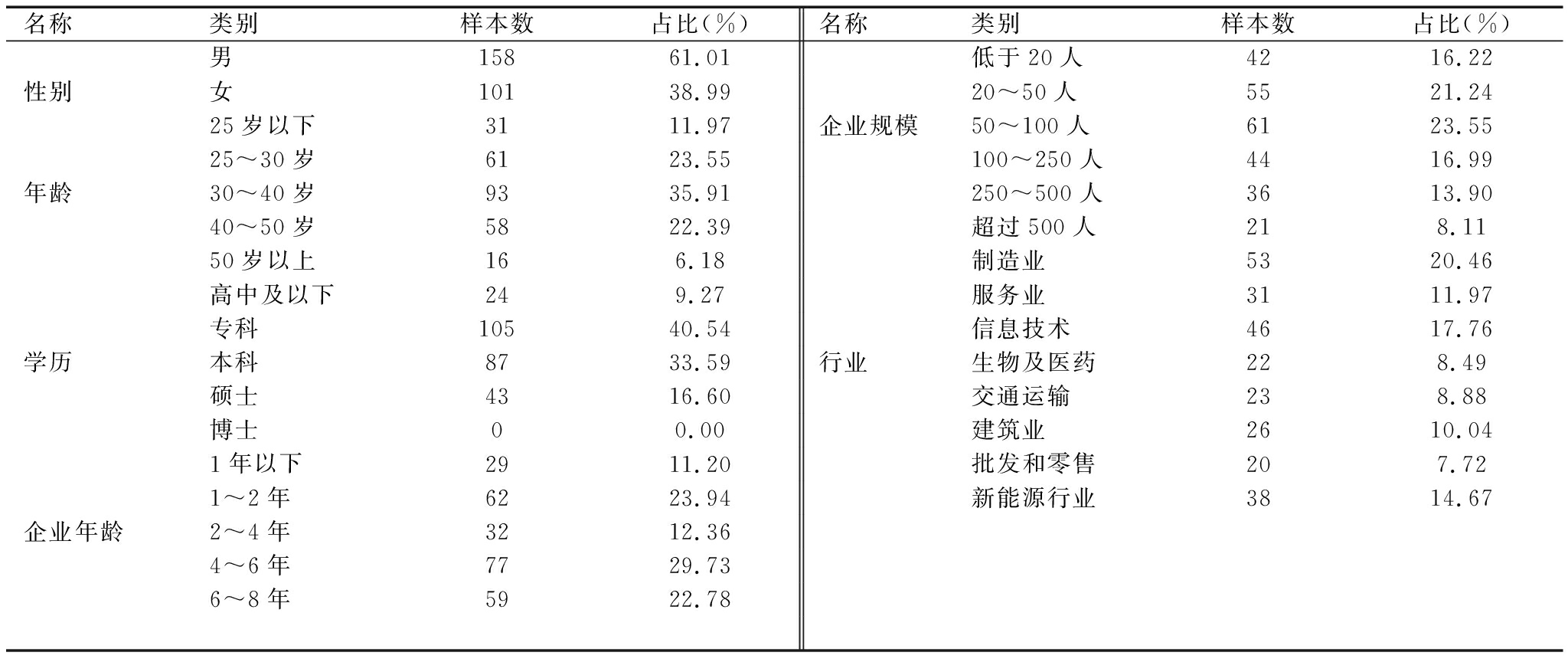 本研究采用线上和线下问卷相结合的方法收集数据。一方面,在重庆、成都两地选取创业孵化中心和大学科技园企业作为调研对象;另一方面,与一家专业调研公司展开合作进行问卷发放。首先,根据现有研究对创业企业的界定,选取那些创办伊始尚未超过8年的创业企业作为研究样本,并向企业高管或创办人发放问卷;其次,为提高数据质量和样本效度,多次与调研公司进行沟通,向其阐述研究框架及主要目的,尽可能向创业企业传达问卷填写的重要性和注意事项,确保填写者能够根据真实情况填写,同时向创业者作出保密承诺。此外,设置同样的问题 (若同一份问卷顺序相连的相同两题回答相异,则予以删除),并结合答卷者回答时间(删除不到5分钟的答卷)剔除无效问卷。本次调研共发放问卷508份,回收有效问卷259份,有效问卷回收率为50.98%,样本总体分布特征如表1所示。