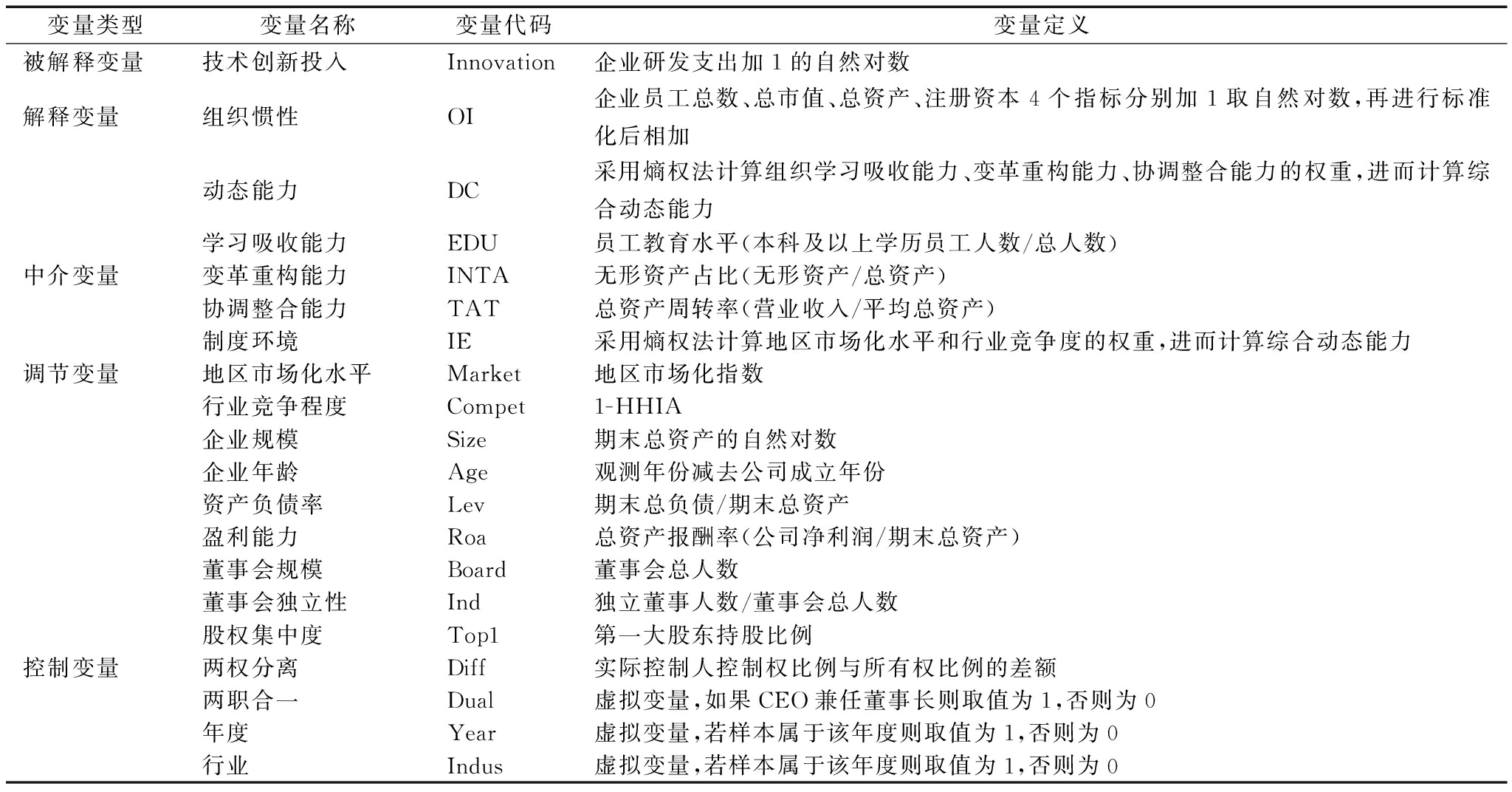 变量类型变量名称变量代码变量定义被解释变量技术创新投入Innovation企业研发支出加1的自然对数解释变量组织惯性OI企业员工总数、总市值、总资产、注册资本4个指标分别加1取自然对数,再进行标准化后相加动态能力DC采用熵权法计算组织学习吸收能力、变革重构能力、协调整合能力的权重,进而计算综合动态能力学习吸收能力EDU员工教育水平(本科及以上学历员工人数/总人数)中介变量变革重构能力INTA无形资产占比(无形资产/总资产)协调整合能力TAT总资产周转率(营业收入/平均总资产)制度环境IE采用熵权法计算地区市场化水平和行业竞争度的权重,进而计算综合动态能力调节变量地区市场化水平Market地区市场化指数行业竞争程度Compet1-HHIA企业规模Size期末总资产的自然对数企业年龄Age观测年份减去公司成立年份资产负债率Lev期末总负债/期末总资产盈利能力Roa总资产报酬率(公司净利润/期末总资产)董事会规模Board董事会总人数董事会独立性Ind独立董事人数/董事会总人数股权集中度Top1第一大股东持股比例控制变量两权分离Diff实际控制人控制权比例与所有权比例的差额两职合一Dual虚拟变量,如果CEO兼任董事长则取值为1,否则为0年度Year虚拟变量,若样本属于该年度则取值为1,否则为0行业Indus虚拟变量,若样本属于该年度则取值为1,否则为0