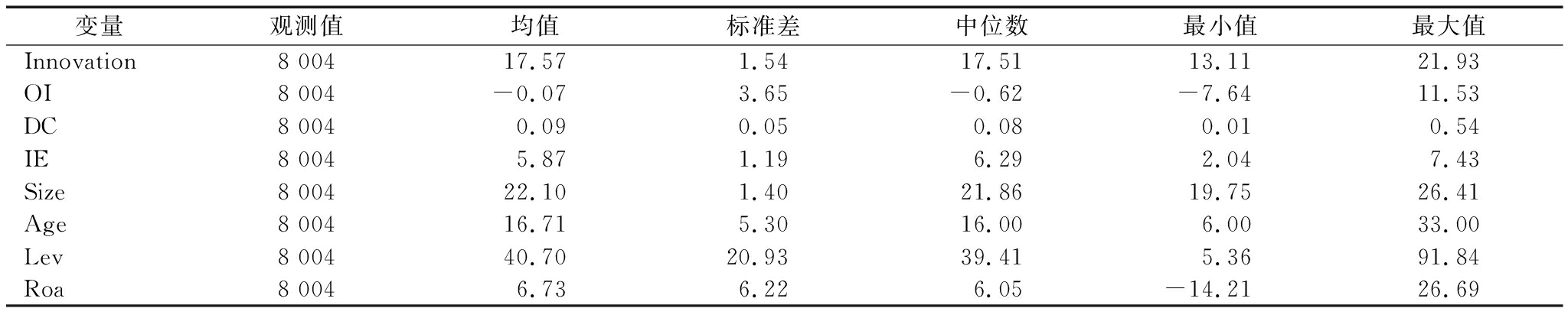 变量观测值均值标准差中位数最小值最大值Innovation8 00417.571.5417.5113.1121.93OI8 004-0.073.65-0.62-7.6411.53DC8 0040.090.050.080.010.54IE8 0045.871.196.292.047.43Size8 00422.101.4021.8619.7526.41Age8 00416.715.3016.006.0033.00Lev8 00440.7020.9339.415.3691.84Roa8 0046.736.226.05-14.2126.69