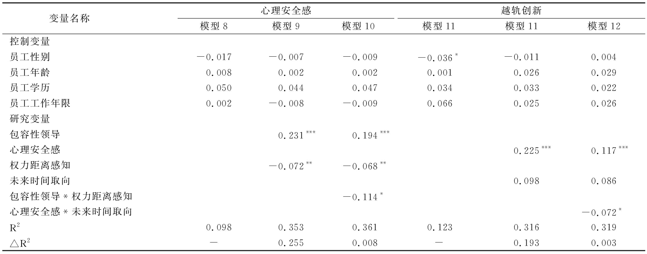 变量名称 心理安全感模型8模型9模型10越轨创新模型11模型11模型12控制变量员工性别-0.017-0.007-0.009-0.036*-0.0110.004员工年龄0.0080.0020.0020.0010.0260.029员工学历0.0500.0440.0470.0340.0330.022员工工作年限0.002-0.008-0.0090.0660.0250.026研究变量包容性领导0.231***0.194***心理安全感0.225***0.117***权力距离感知-0.072**-0.068**未来时间取向0.0980.086包容性领导*权力距离感知-0.114*心理安全感*未来时间取向-0.072*R20.0980.3530.3610.1230.3160.319△R2-0.2550.008-0.1930.003