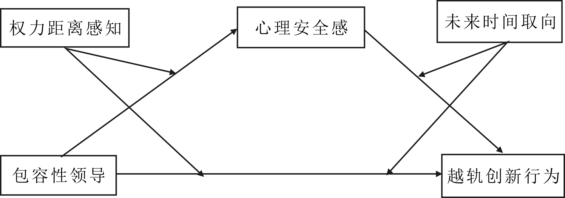 和合文化强调和而不同,追求“和同”而非“专同”,要求领导者容忍员工差异、尊重多样性,和合包容,以达成组织的和谐统一。这种能包容下属个性、尊重下属差异、容忍下属失误、认可下属贡献的领导风格被称为包容性领导[9]。实证研究表明,包容性领导与家长式领导、交易型领导及变革型领导相比,更加契合复杂的管理情境[10]。已有研究注意到包容性领导风格对员工建设性越轨创新行为的影响[11],并检验员工心理所有权的中介作用和员工传统性的调节作用[12]。但在中国和合文化情境下,学者对包容性领导影响员工越轨创新作用机制的探讨较少。越轨创新是员工自愿实施的角色外行为,需要员工承担一定压力和付出较多资源,个体资源条件很可能影响员工是否实施越轨创新。资源保存理论认为,个体会努力维持现有资源,降低资源损失威胁性,并根据外部环境调整行为选择;资源储备较多的个体会努力获取其它资源,进行资源投资以培育资源增殖螺旋[13]。根据资源保存理论,包容性领导能够对员工越轨创新产生影响,并在一定程度上与领导所提供的资源相关联。心理安全感是影响员工行为的重要条件性资源,包容性领导可以提高员工心理安全感,增加员工资源储量,使员工创造和获取其它资源的意愿超过保护现存资源的意愿,进而激发越轨创新。因此,本研究认为心理安全感是中介包容性领导与员工越轨创新关系的重要变量。此外,受和合文化情境影响的中国是一个权力距离感知较高的社会,“上下有别”“尊卑有序”是中国文化权力距离感知的有力体现,中国也是一个注重未来发展、具有前瞻性眼光的国家,“未雨绸缪”“谋先则事昌”是中国文化未来时间取向的强烈表达。不同权力距离感知员工获取资源存在差异,即便领导表现出包容性特征,高权力距离感知员工由于习惯于畏惧和服从领导权威,较难获取更多资源,也不易产生资源冒险投资行为,低权力距离感知员工则相反。越轨创新具有高风险性,然而一旦成功,伴随而来的是高收益。高未来时间取向员工为维护已有资源,减少资源损失,实施越轨创新的可能性较低,而低未来时间取向员工则会投入资源冒险进行越轨创新。因此,本文选取员工权力距离感知和未来时间取向两个变量,分析文化价值观因素对包容性领导与员工越轨创新间关系的权变影响。