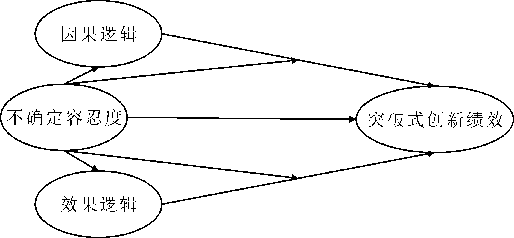 在探讨不确定性容忍度对突破式创新的影响机制方面,本文不仅考虑两者的直接影响路径,还进一步分析其间接影响路径。不确定性容忍度体现的是个体对待不确定性的心理感受,而个体内在因素差异将产生不同的行为倾向,进而导致不同的行为结果。决策逻辑是个体在进行决策时表现的行为倾向,包括因果逻辑和效果逻辑两种决策方式。已有研究表明,不确定性水平与决策逻辑之间有显著关系[8],不同的决策逻辑方式会对创新行为产生不同影响[9]。因此,本研究将决策逻辑作为中介变量探讨不确定性容忍度对突破式创新的影响。同时,本研究认为,当个体选择不同的决策逻辑时,不确定性容忍度不同的个体在面对突破式创新中的不确定性时所表现出来的态度和行为差异也将影响决策效果,即不确定性容忍度会调节决策逻辑和突破式创新的关系。