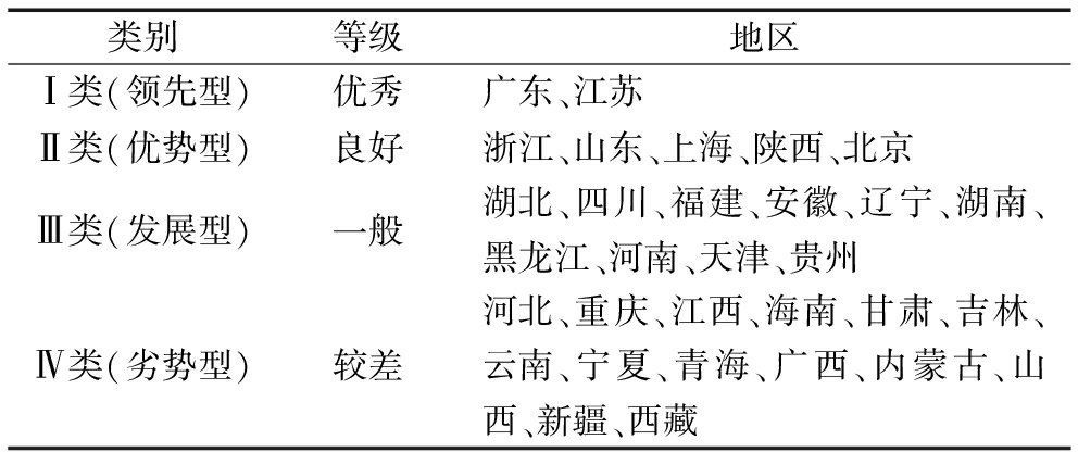 类别等级地区Ⅰ类(领先型)优秀广东、江苏Ⅱ类(优势型)良好浙江、山东、上海、陕西、北京Ⅲ类(发展型)一般湖北、四川、福建、安徽、辽宁、湖南、黑龙江、河南、天津、贵州Ⅳ类(劣势型)较差河北、重庆、江西、海南、甘肃、吉林、云南、宁夏、青海、广西、内蒙古、山西、新疆、西藏