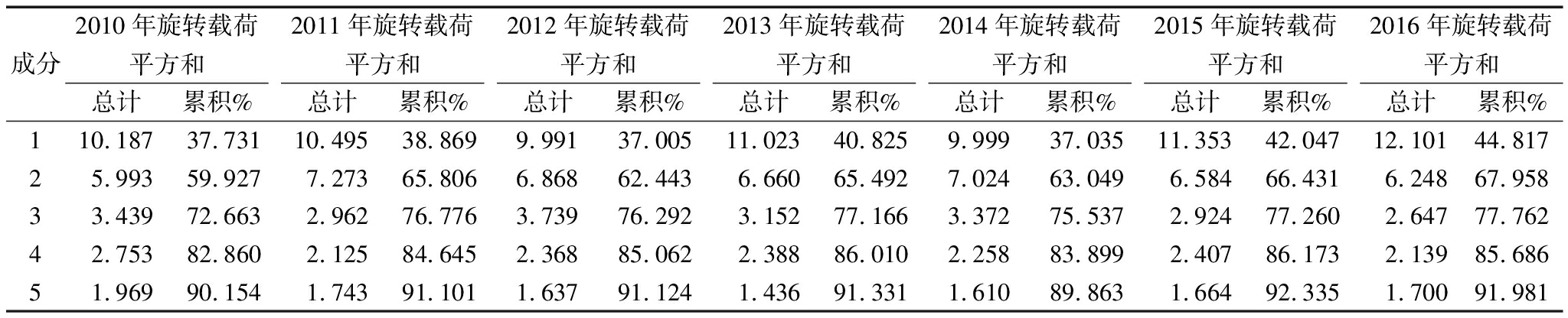 表3 2010-2016年旋转后的特征值与累计贡献率