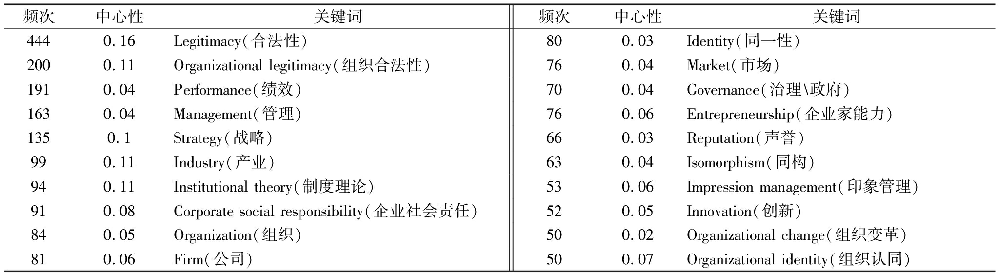 频次中心性关键词频次中心性关键词4440.16Legitimacy(合法性)800.03Identity(同一性)2000.11Organizational legitimacy(组织合法性)760.04Market(市场)1910.04Performance(绩效)700.04Governance(治理\政府)1630.04Management(管理)760.06Entrepreneurship(企业家能力)1350.1Strategy(战略)660.03Reputation(声誉)990.11Industry(产业)630.04Isomorphism(同构)940.11Institutional theory(制度理论)530.06Impression management(印象管理)910.08Corporate social responsibility(企业社会责任)520.05Innovation(创新)840.05Organization(组织)500.02Organizational change(组织变革)810.06Firm(公司)500.07Organizational identity(组织认同)