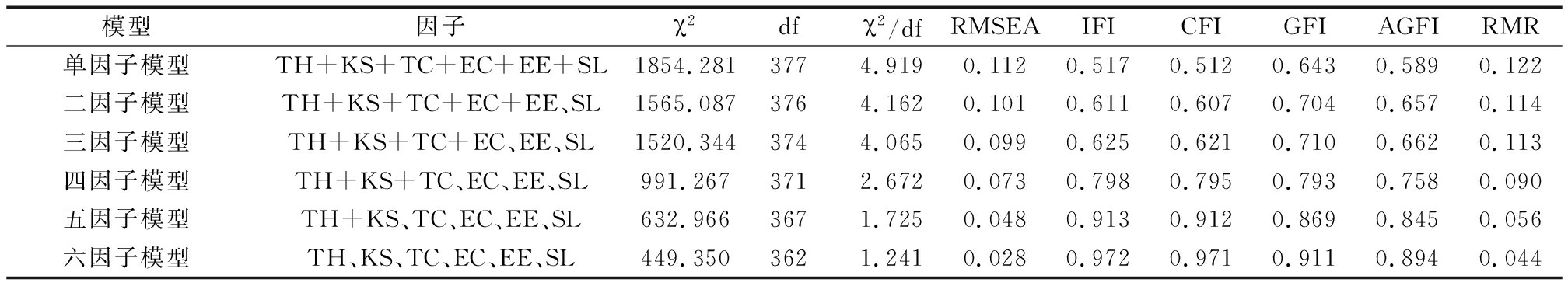 模型因子χ2dfχ2/dfRMSEAIFICFIGFIAGFIRMR单因子模型TH+KS+TC+EC+EE+SL1854.2813774.9190.1120.5170.5120.6430.5890.122二因子模型TH+KS+TC+EC+EE、SL1565.0873764.1620.1010.6110.6070.7040.6570.114三因子模型TH+KS+TC+EC、EE、SL1520.3443744.0650.0990.6250.6210.7100.6620.113四因子模型TH+KS+TC、EC、EE、SL991.2673712.6720.0730.7980.7950.7930.7580.090五因子模型TH+KS、TC、EC、EE、SL632.9663671.7250.0480.9130.9120.8690.8450.056六因子模型TH、KS、TC、EC、EE、SL449.3503621.2410.0280.9720.9710.9110.8940.044