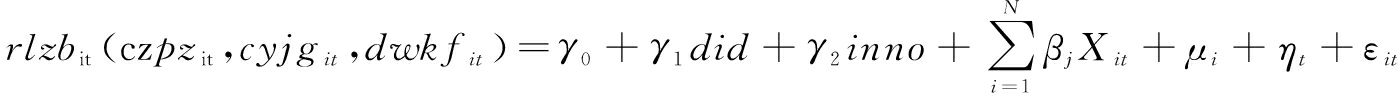其中,inno为城市创新指标,用人均专利授权数表示,预期符号为正,表明国家高新区设立促进了城市创新。rlzb为人力资本效应,衡量指标为每万人普通高等学校在校学生数,高新区对人力资本的要求较高,可能会影响该地区技术创新能力。czpz为财政配置效应,用地方财政支出中科研事业费支出占GDP的比重表示。高新区多为技术密集型企业,增加研发投入可能提高资源利用效率。cyjg为产业结构效应,用第三产业GDP和第二产业GDP的比重表示。dwkf为对外开放效应,用实际利用外资金额占GDP的比重表示。