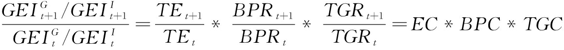 为了检验国家高新区设立对绿色经济增长的影响机制,将绿色全要素增长率指标分解为追赶效应(EC)、创新效应(BPC)和技术领导者转移效应(TGC)3个部分。其中,C、I和G分别表示当期组群、跨期组群和全局。TE、BPR和TGR分别表示技术效率、当期组群和跨期组群技术的差距、跨期组群技术和全局技术的差距。EC测度组群内绿色全要素效率在两期的变化,表示组群内决策单元对当期技术前沿面的“追赶效应”,EC>1表示决策单元相较于上期更接近当期组群内技术前沿面。BPC表示组群内跨期技术相比当期技术水平下绿色全要素效率变化,BPC>1表示当期技术前沿面靠近跨期技术前沿面,称为组群内绿色全要素效率的“创新效应”,即促使组群当期技术前沿面偏向组群内跨期技术前沿面。TGC表示特定组群与全局技术之间技术差距的变化,TGC>1表示决策单元对应的跨期组群技术相较全局技术的差距在缩小,TGC可以判断哪些决策单元向全局技术靠近的速度更快,相对速度可能在不同决策单元之间发生变化,称为相对全局前沿面的“技术领导者转移效应”[17]。