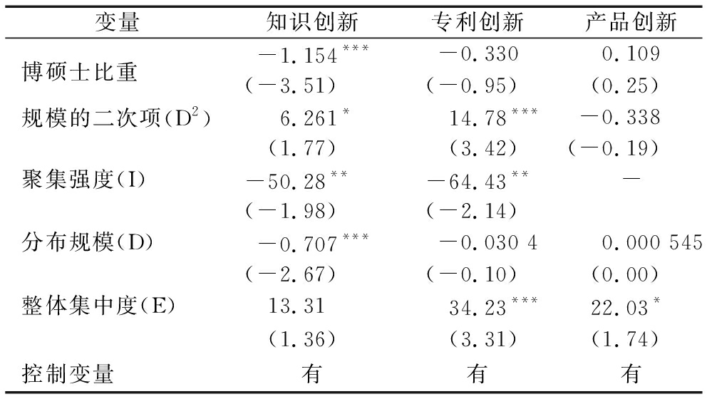变量知识创新专利创新产品创新博硕士比重-1.154***-0.3300.109(-3.51)(-0.95)(0.25)规模的二次项(D2)6.261*14.78***-0.338(1.77)(3.42)(-0.19)聚集强度(I)-50.28**-64.43**-(-1.98)(-2.14)分布规模(D)-0.707***-0.030 40.000 545(-2.67)(-0.10)(0.00)整体集中度(E)13.3134.23***22.03*(1.36)(3.31)(1.74)控制变量有有有