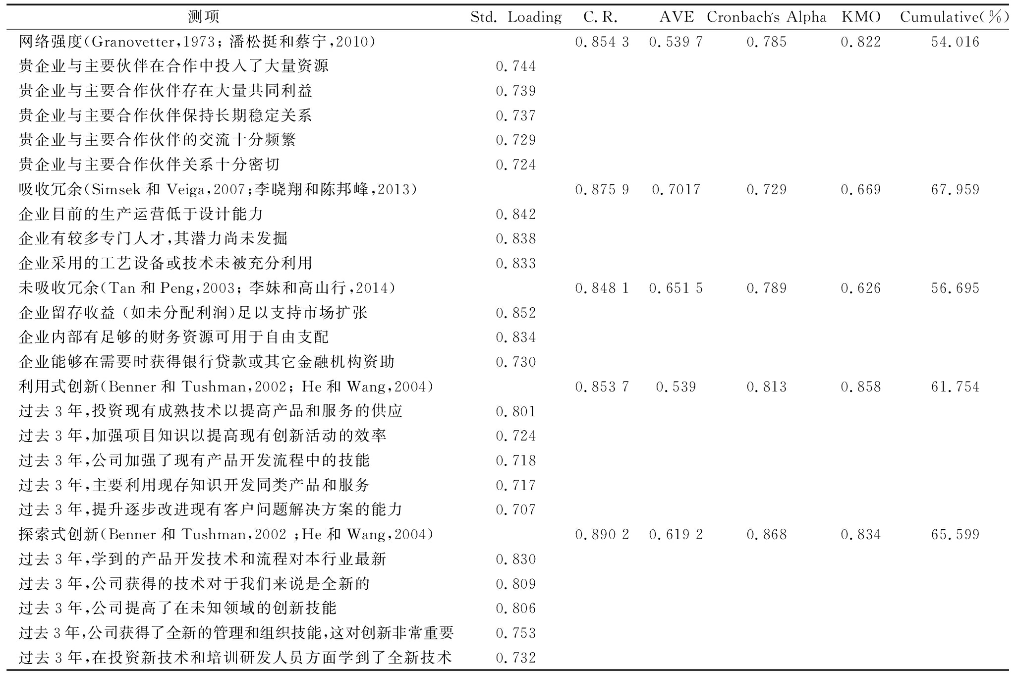 测项 Std. LoadingC.R.AVECronbach's AlphaKMOCumulative(%)网络强度(Granovetter,1973; 潘松挺和蔡宁,2010)0.854 30.539 70.7850.82254.016贵企业与主要伙伴在合作中投入了大量资源0.744贵企业与主要合作伙伴存在大量共同利益0.739贵企业与主要合作伙伴保持长期稳定关系0.737贵企业与主要合作伙伴的交流十分频繁0.729贵企业与主要合作伙伴关系十分密切0.724吸收冗余(Simsek和Veiga,2007;李晓翔和陈邦峰,2013)0.875 90.70170.7290.66967.959企业目前的生产运营低于设计能力0.842企业有较多专门人才,其潜力尚未发掘0.838企业采用的工艺设备或技术未被充分利用0.833未吸收冗余(Tan和Peng,2003; 李妹和高山行,2014)0.848 10.651 50.7890.62656.695企业留存收益 (如未分配利润)足以支持市场扩张0.852企业内部有足够的财务资源可用于自由支配0.834企业能够在需要时获得银行贷款或其它金融机构资助0.730利用式创新(Benner和Tushman,2002; He和Wang,2004)0.853 70.5390.8130.85861.754过去3年,投资现有成熟技术以提高产品和服务的供应0.801过去3年,加强项目知识以提高现有创新活动的效率0.724过去3年,公司加强了现有产品开发流程中的技能0.718过去3年,主要利用现存知识开发同类产品和服务0.717过去3年,提升逐步改进现有客户问题解决方案的能力0.707探索式创新(Benner和Tushman,2002 ;He和Wang,2004)0.890 20.619 20.8680.83465.599过去3年,学到的产品开发技术和流程对本行业最新0.830过去3年,公司获得的技术对于我们来说是全新的0.809过去3年,公司提高了在未知领域的创新技能0.806过去3年,公司获得了全新的管理和组织技能,这对创新非常重要0.753过去3年,在投资新技术和培训研发人员方面学到了全新技术0.732