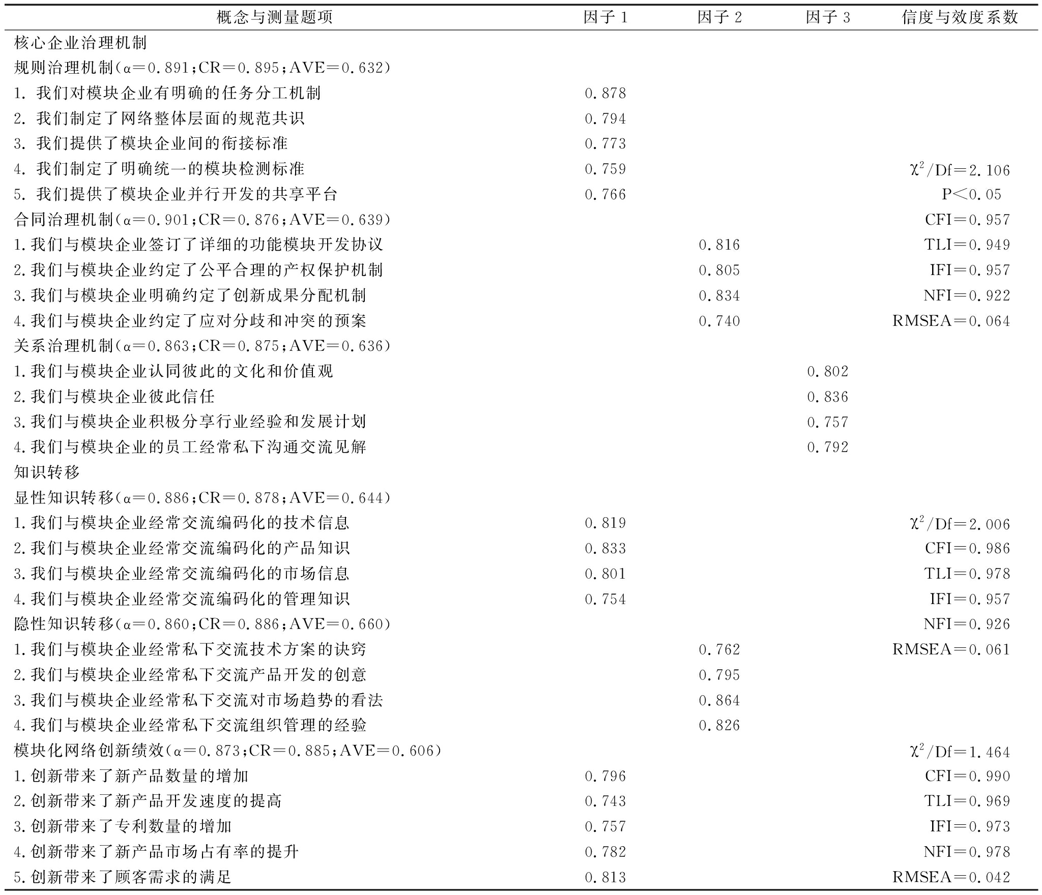 概念与测量题项因子1因子2因子3信度与效度系数核心企业治理机制规则治理机制(α=0.891;CR=0.895;AVE=0.632)1. 我们对模块企业有明确的任务分工机制0.8782. 我们制定了网络整体层面的规范共识0.7943. 我们提供了模块企业间的衔接标准0.7734. 我们制定了明确统一的模块检测标准0.759χ2/Df=2.1065. 我们提供了模块企业并行开发的共享平台0.766P<0.05合同治理机制(α=0.901;CR=0.876;AVE=0.639)CFI=0.9571.我们与模块企业签订了详细的功能模块开发协议0.816TLI=0.9492.我们与模块企业约定了公平合理的产权保护机制0.805IFI=0.9573.我们与模块企业明确约定了创新成果分配机制0.834NFI=0.9224.我们与模块企业约定了应对分歧和冲突的预案0.740RMSEA=0.064关系治理机制(α=0.863;CR=0.875;AVE=0.636)1.我们与模块企业认同彼此的文化和价值观0.8022.我们与模块企业彼此信任0.8363.我们与模块企业积极分享行业经验和发展计划0.7574.我们与模块企业的员工经常私下沟通交流见解0.792知识转移显性知识转移(α=0.886;CR=0.878;AVE=0.644)1.我们与模块企业经常交流编码化的技术信息0.819χ2/Df=2.0062.我们与模块企业经常交流编码化的产品知识0.833CFI=0.9863.我们与模块企业经常交流编码化的市场信息0.801TLI=0.9784.我们与模块企业经常交流编码化的管理知识0.754IFI=0.957隐性知识转移(α=0.860;CR=0.886;AVE=0.660)NFI=0.9261.我们与模块企业经常私下交流技术方案的诀窍0.762RMSEA=0.0612.我们与模块企业经常私下交流产品开发的创意0.7953.我们与模块企业经常私下交流对市场趋势的看法0.8644.我们与模块企业经常私下交流组织管理的经验0.826模块化网络创新绩效(α=0.873;CR=0.885;AVE=0.606)χ2/Df=1.4641.创新带来了新产品数量的增加0.796CFI=0.9902.创新带来了新产品开发速度的提高0.743TLI=0.9693.创新带来了专利数量的增加0.757IFI=0.9734.创新带来了新产品市场占有率的提升0.782NFI=0.9785.创新带来了顾客需求的满足0.813RMSEA=0.042