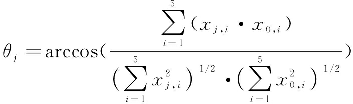 选择基本单位向量组X1=(1,0,0,0,0),X2=(0,1,0,0,0),X3=(0,0,1,0,0),X4=(0,0,0,1,0),X5=(0,0,0,0,1)。计算人力资本空间向量X0与基准向量的夹角θj(j=1,…,5)。
