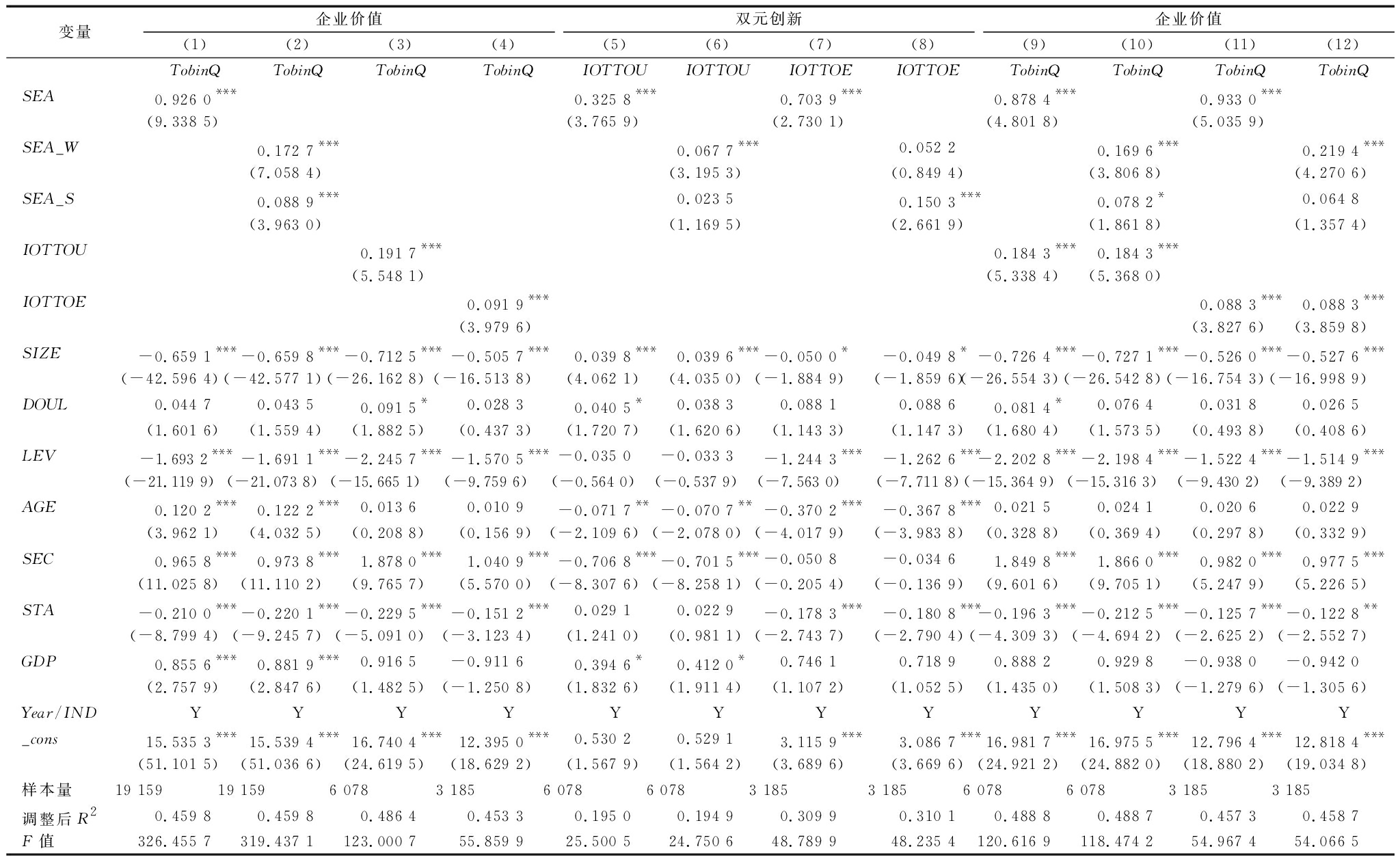 变量企业价值(1)(2)(3)(4)双元创新(5)(6)(7)(8)企业价值(9)(10)(11)(12)TobinQTobinQTobinQTobinQIOTTOUIOTTOUIOTTOEIOTTOETobinQTobinQTobinQTobinQSEA0.926 0***0.325 8***0.703 9***0.878 4***0.933 0***(9.338 5)(3.765 9)(2.730 1)(4.801 8)(5.035 9)SEA_W0.172 7***0.067 7***0.052 20.169 6***0.219 4***(7.058 4)(3.195 3)(0.849 4)(3.806 8)(4.270 6)SEA_S0.088 9***0.023 50.150 3***0.078 2*0.064 8(3.963 0)(1.169 5)(2.661 9)(1.861 8)(1.357 4)IOTTOU0.191 7***0.184 3***0.184 3***(5.548 1)(5.338 4)(5.368 0)IOTTOE0.091 9***0.088 3***0.088 3***(3.979 6)(3.827 6)(3.859 8)SIZE-0.659 1***-0.659 8***-0.712 5***-0.505 7***0.039 8***0.039 6***-0.050 0*-0.049 8*-0.726 4***-0.727 1***-0.526 0***-0.527 6***(-42.596 4)(-42.577 1)(-26.162 8)(-16.513 8)(4.062 1)(4.035 0)(-1.884 9)(-1.859 6)(-26.554 3)(-26.542 8)(-16.754 3)(-16.998 9)DOUL0.044 70.043 50.091 5*0.028 30.040 5*0.038 30.088 10.088 60.081 4*0.076 40.031 80.026 5(1.601 6)(1.559 4)(1.882 5)(0.437 3)(1.720 7)(1.620 6)(1.143 3)(1.147 3)(1.680 4)(1.573 5)(0.493 8)(0.408 6)LEV-1.693 2***-1.691 1***-2.245 7***-1.570 5***-0.035 0-0.033 3-1.244 3***-1.262 6***-2.202 8***-2.198 4***-1.522 4***-1.514 9***(-21.119 9)(-21.073 8)(-15.665 1)(-9.759 6)(-0.564 0)(-0.537 9)(-7.563 0)(-7.711 8)(-15.364 9)(-15.316 3)(-9.430 2)(-9.389 2)AGE0.120 2***0.122 2***0.013 60.010 9-0.071 7**-0.070 7**-0.370 2***-0.367 8***0.021 50.024 10.020 60.022 9(3.962 1)(4.032 5)(0.208 8)(0.156 9)(-2.109 6)(-2.078 0)(-4.017 9)(-3.983 8)(0.328 8)(0.369 4)(0.297 8)(0.332 9)SEC0.965 8***0.973 8***1.878 0***1.040 9***-0.706 8***-0.701 5***-0.050 8-0.034 61.849 8***1.866 0***0.982 0***0.977 5***(11.025 8)(11.110 2)(9.765 7)(5.570 0)(-8.307 6)(-8.258 1)(-0.205 4)(-0.136 9)(9.601 6)(9.705 1)(5.247 9)(5.226 5)STA-0.210 0***-0.220 1***-0.229 5***-0.151 2***0.029 10.022 9-0.178 3***-0.180 8***-0.196 3***-0.212 5***-0.125 7***-0.122 8**(-8.799 4)(-9.245 7)(-5.091 0)(-3.123 4)(1.241 0)(0.981 1)(-2.743 7)(-2.790 4)(-4.309 3)(-4.694 2)(-2.625 2)(-2.552 7)GDP0.855 6***0.881 9***0.916 5-0.911 60.394 6*0.412 0*0.746 10.718 90.888 20.929 8-0.938 0-0.942 0(2.757 9)(2.847 6)(1.482 5)(-1.250 8)(1.832 6)(1.911 4)(1.107 2)(1.052 5)(1.435 0)(1.508 3)(-1.279 6)(-1.305 6)Year/INDYYYYYYYYYYYY_cons15.535 3***15.539 4***16.740 4***12.395 0***0.530 20.529 13.115 9***3.086 7***16.981 7***16.975 5***12.796 4***12.818 4***(51.101 5)(51.036 6)(24.619 5)(18.629 2)(1.567 9)(1.564 2)(3.689 6)(3.669 6)(24.921 2)(24.882 0)(18.880 2)(19.034 8)样本量19 15919 1596 0783 1856 0786 0783 1853 1856 0786 0783 1853 185调整后R20.459 80.459 80.486 40.453 30.195 00.194 90.309 90.310 10.488 80.488 70.457 30.458 7F值326.455 7319.437 1123.000 755.859 925.500 524.750 648.789 948.235 4120.616 9118.474 254.967 454.066 5