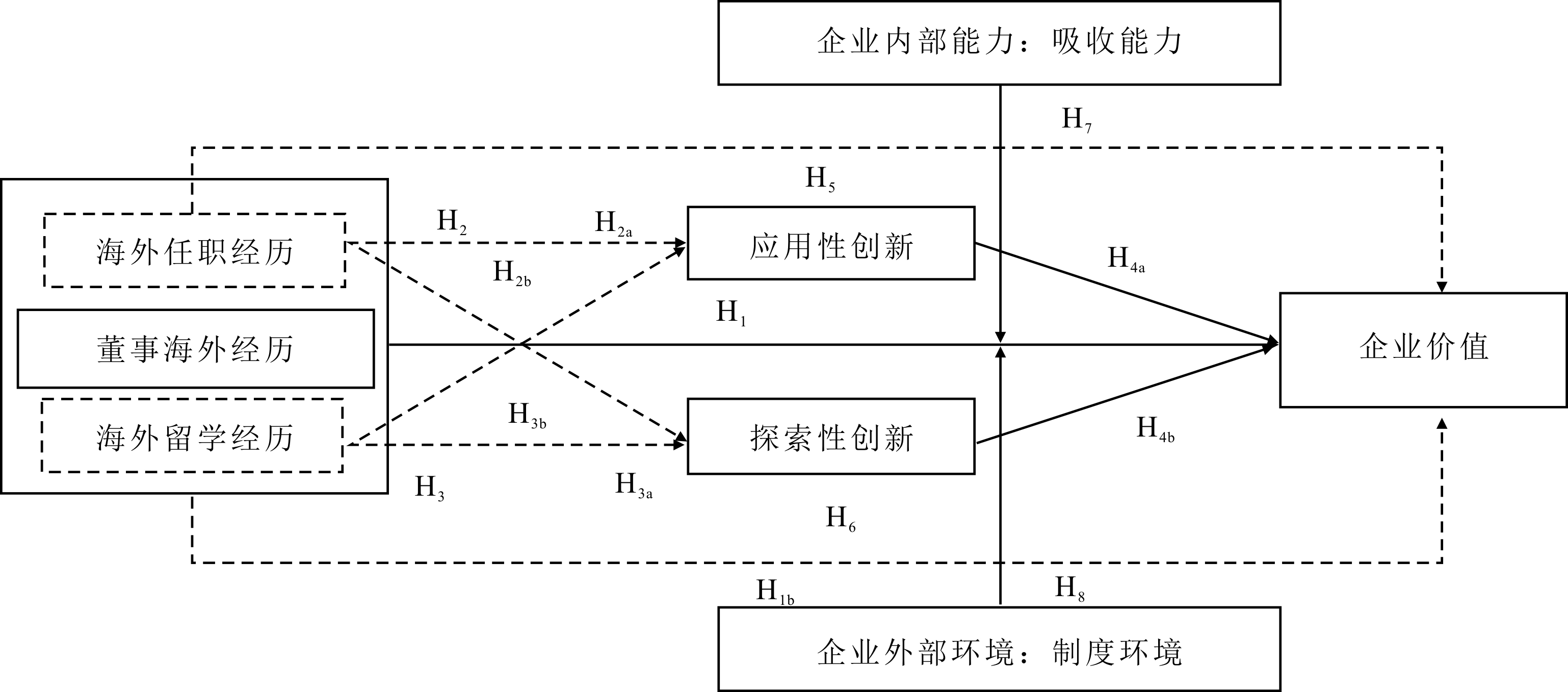 现阶段,中国经济由投资驱动、要素驱动转向创新驱动,相应地,技术、知识等新兴生产要素成为企业成长的主要推动力[12]。已有研究证实海归人才可凭借其人力资本效应、溢出效应等多种方式提升企业技术创新能力[6],但忽略了其对不同类型创新的影响是否存在差异。此外,为何规模、功能、结构相同的上市公司即便存在相同数量的海归董事,其价值创造与价值实现依然存在较大差异?这就不得不考虑特定情景条件或权变因素对烙印效应的作用[13]。一方面,海归董事虽然能为企业引进有价值的外部信息和资源,但由于受到资源有限性及管理层能力的限制,导致企业无法利用所有外部资源[14];另一方面,中国处于经济转型升级阶段,依然面临制度环境不健全、市场发育不成熟等问题[4],“渐进式”市场化制度转型方式进一步加剧了中国区域间制度环境差异[15],这些差异能否影响海归董事发挥作用尚需进一步研究。综上所述,本文将双元创新中介效应以及吸收能力和制度环境的调节效应纳入研究框架,探究海外经历发挥作用的具体路径,以及识别影响其发挥作用的内外部关键因素。
