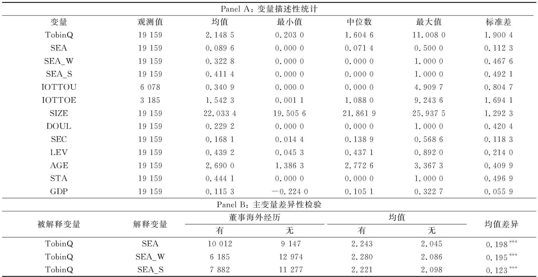 Panel A: 变量描述性统计变量观测值均值最小值中位数最大值标准差TobinQ19 1592.148 50.203 01.604 611.008 01.900 4SEA19 1590.089 60.000 00.071 40.500 00.112 3SEA_W19 1590.322 80.000 00.000 01.000 00.467 6SEA_S19 1590.411 40.000 00.000 01.000 00.492 1IOTTOU6 0780.340 90.000 00.000 04.909 70.804 7IOTTOE3 1851.542 30.001 11.088 09.243 61.694 1SIZE19 15922.033 419.505 621.861 925.937 51.292 3DOUL19 1590.229 20.000 00.000 01.000 00.420 4SEC19 1590.168 10.014 40.138 90.568 60.118 3LEV19 1590.439 20.045 30.437 10.892 00.214 0AGE19 1592.690 01.386 32.772 63.367 30.409 9STA19 1590.444 10.000 00.000 01.000 00.496 9GDP19 1590.115 3-0.224 00.105 10.322 70.055 9Panel B: 主变量差异性检验被解释变量解释变量董事海外经历有无均值有无均值差异TobinQSEA10 0129 1472.2432.0450.198***TobinQSEA_W6 18512 9742.2802.0860.195***TobinQSEA_S7 88211 2772.2212.0980.123***
