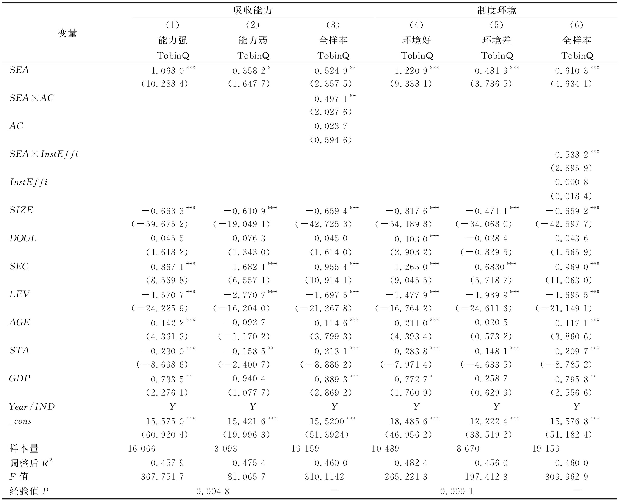 变量吸收能力(1)能力强TobinQ(2)能力弱TobinQ(3)全样本TobinQ制度环境(4)环境好TobinQ(5)环境差TobinQ(6)全样本TobinQSEA1.068 0***0.358 2*0.524 9**1.220 9***0.481 9***0.610 3***(10.288 4)(1.647 7)(2.357 5)(9.338 1)(3.736 5)(4.634 1)SEA×AC0.497 1**(2.027 6)AC0.023 7(0.594 6)SEA×InstEffi0.538 2***(2.895 9)InstEffi0.000 8(0.018 4)SIZE-0.663 3***-0.610 9***-0.659 4***-0.817 6***-0.471 1***-0.659 2***(-59.675 2)(-19.049 1)(-42.725 3)(-54.189 8)(-34.068 0)(-42.597 7)DOUL0.045 50.076 30.045 00.103 0***-0.028 40.043 6(1.618 2)(1.343 0)(1.614 0)(2.903 2)(-0.829 5)(1.565 9)SEC0.867 1***1.682 1***0.955 4***1.265 0***0.6830***0.969 0***(8.569 8)(6.557 1)(10.914 1)(9.045 5)(5.718 7)(11.063 0)LEV-1.570 7***-2.770 7***-1.697 5***-1.477 9***-1.939 9***-1.695 5***(-24.225 9)(-16.204 0)(-21.267 8)(-16.764 2)(-24.611 6)(-21.149 1)AGE0.142 2***-0.092 70.114 6***0.211 0***0.020 50.117 1***(4.361 3)(-1.170 2)(3.799 3)(4.393 4)(0.573 2)(3.860 6)STA-0.230 0***-0.158 5**-0.213 1***-0.283 8***-0.148 1***-0.209 7***(-8.698 6)(-2.400 7)(-8.886 2)(-7.971 4)(-4.633 5)(-8.785 2)GDP0.733 5**0.940 40.889 3***0.772 7*0.258 70.795 8**(2.276 1)(1.077 7)(2.869 2)(1.760 9)(0.629 9)(2.556 6)Year/INDYYYYYY_cons15.575 0***15.421 6***15.5200***18.485 6***12.222 4***15.576 8***(60.920 4)(19.996 3)(51.3924)(46.956 2)(38.519 2)(51.182 4)样本量16 0663 09319 15910 4898 67019 159调整后R20.457 90.475 40.460 00.482 40.456 00.460 0F值367.751 781.065 7310.1142265.221 3197.412 3309.962 9经验值P0.004 8-0.000 1-