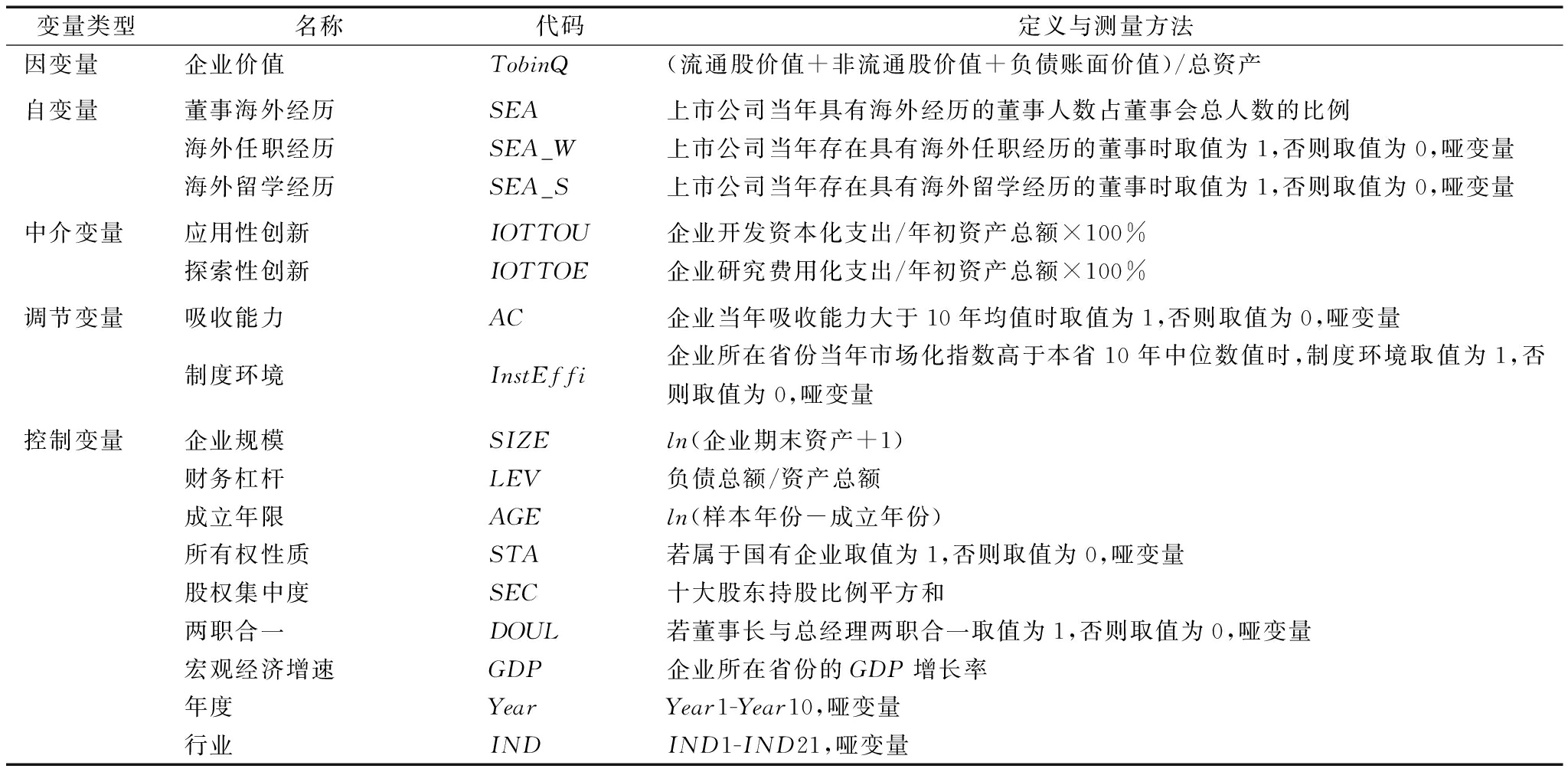 变量类型名称代码定义与测量方法因变量企业价值TobinQ(流通股价值+非流通股价值+负债账面价值)/总资产自变量董事海外经历SEA上市公司当年具有海外经历的董事人数占董事会总人数的比例海外任职经历SEA_W上市公司当年存在具有海外任职经历的董事时取值为1,否则取值为0,哑变量海外留学经历SEA_S上市公司当年存在具有海外留学经历的董事时取值为1,否则取值为0,哑变量中介变量应用性创新IOTTOU企业开发资本化支出/年初资产总额×100%探索性创新IOTTOE企业研究费用化支出/年初资产总额×100%调节变量吸收能力AC企业当年吸收能力大于10年均值时取值为1,否则取值为0,哑变量制度环境InstEffi企业所在省份当年市场化指数高于本省10年中位数值时,制度环境取值为1,否则取值为0,哑变量控制变量企业规模SIZEln(企业期末资产+1)财务杠杆LEV负债总额/资产总额成立年限AGEln(样本年份-成立年份)所有权性质STA若属于国有企业取值为1,否则取值为0,哑变量股权集中度SEC十大股东持股比例平方和两职合一DOUL若董事长与总经理两职合一取值为1,否则取值为0,哑变量宏观经济增速GDP企业所在省份的GDP增长率年度YearYear1-Year10,哑变量行业INDIND1-IND21,哑变量