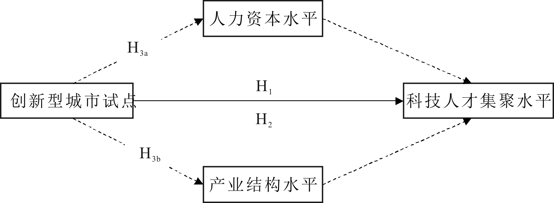创新型城市试点是中国政府创新治理实践模式。通过影响城市制度供给、资金支持、文化建设、基础资源等方面,创新型城市试点可以为城市治理与建设创造条件[9]。目前,现有创新型城市试点政策效应研究大多集中于创新结果,如创新绩效、创新能力、创新水平[10-11],较少涉及创新型城市试点政策对人才集聚水平的影响。无论是国家之间还是特定地区或城市之间,人才在地理上的分布都是不均衡的,而城市在吸引、动员和组织经济活动的人力资本方面具有重要作用[12]。在科技人才流动与分布影响因素的研究中,有学者注意到创新型城市与区域内创新主体的关联,如创新型城市将吸引创新人才作为重要目标,而实际上创新型城市的确具备这一能力[13]。同时,创新型城市以各种政策吸引人才,作为一种城市品牌,其本身具有的创新潜质是吸引人才集聚的重要因素[14]。基于此,本文提出以下假设: