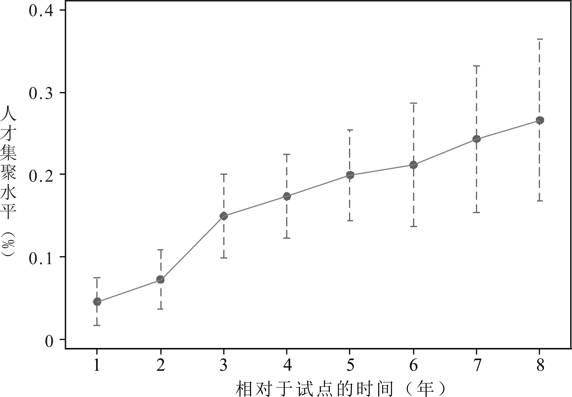 政策预期与政策实际效果之间的差异难以避免,在时间序列上,政策效应存在波动的可能性。既有研究提出政策递减效应,即政策从制定、执行到最终落实的周期中存在走样、变通等问题,导致政策效力逐渐减弱[15]。因此,政策评估不仅应关注短期效应,更需关注长期效应[16]。创新型城市试点政策效果受多重因素影响。理论上,试点政策的确立能够有效激励当地政府部门出台相应办法,这种先行效应能够有效区分试点城市与非试点城市的人才集聚水平。在现实背景下,随时间推移,经济发展与人口结构变化等使得非试点城市也意识到人才对于城市创新发展的关键作用,人才政策对创新型城市试点的人才集聚效应产生挤出作用。由此,本文提出以下假设: