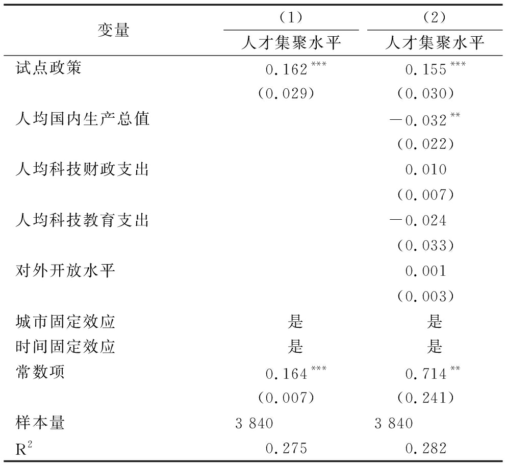 变量(1)人才集聚水平(2)人才集聚水平试点政策0.162***0.155***(0.029)(0.030)人均国内生产总值-0.032**(0.022)人均科技财政支出0.010(0.007)人均科技教育支出-0.024(0.033)对外开放水平0.001(0.003)城市固定效应是是时间固定效应是是常数项0.164***0.714**(0.007)(0.241)样本量3 8403 840R20.2750.282