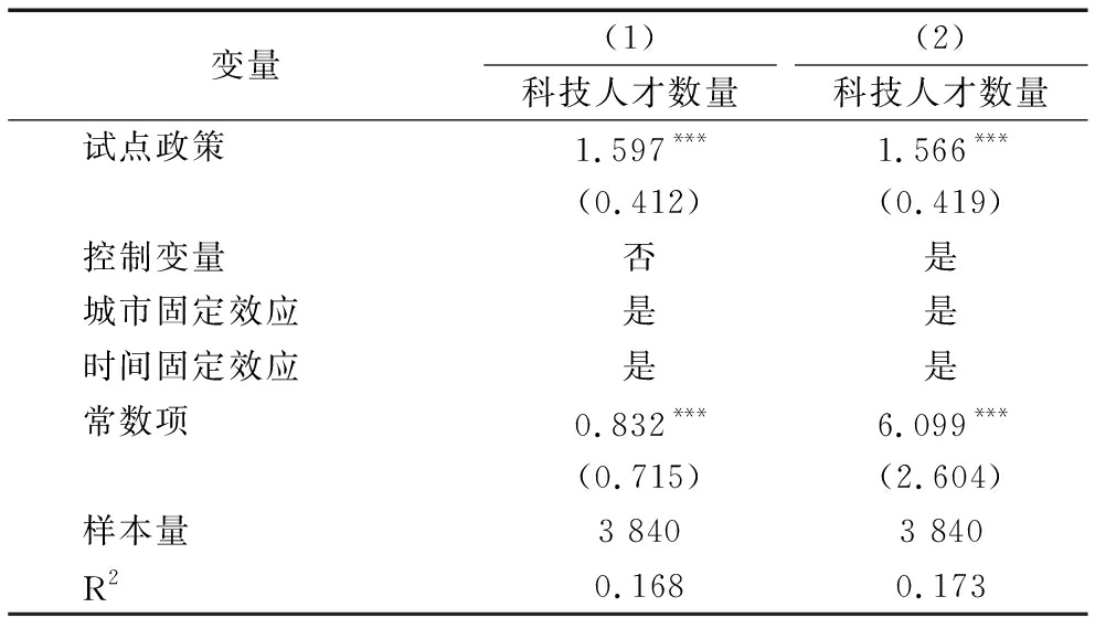 变量(1)科技人才数量(2)科技人才数量试点政策1.597***1.566***(0.412)(0.419)控制变量否是城市固定效应是是时间固定效应是是常数项0.832***6.099***(0.715)(2.604)样本量3 8403 840R20.1680.173