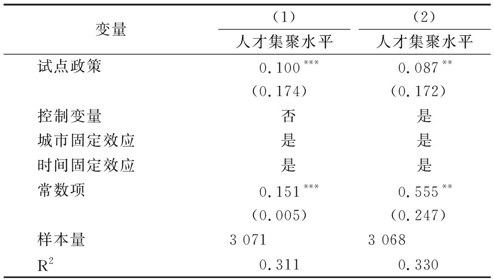 变量(1)人才集聚水平(2)人才集聚水平试点政策0.100***0.087**(0.174)(0.172)控制变量否是城市固定效应是是时间固定效应是是常数项0.151***0.555**(0.005)(0.247)样本量3 0713 068R20.3110.330